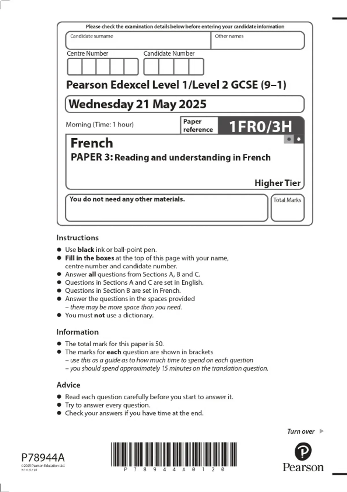 2025 Pearson Edexcel Level 1/Level 2 GCSE (9–1) French PAPER 3: Reading and understanding in French Higher Tier Combined Question Paper & Marking Scheme