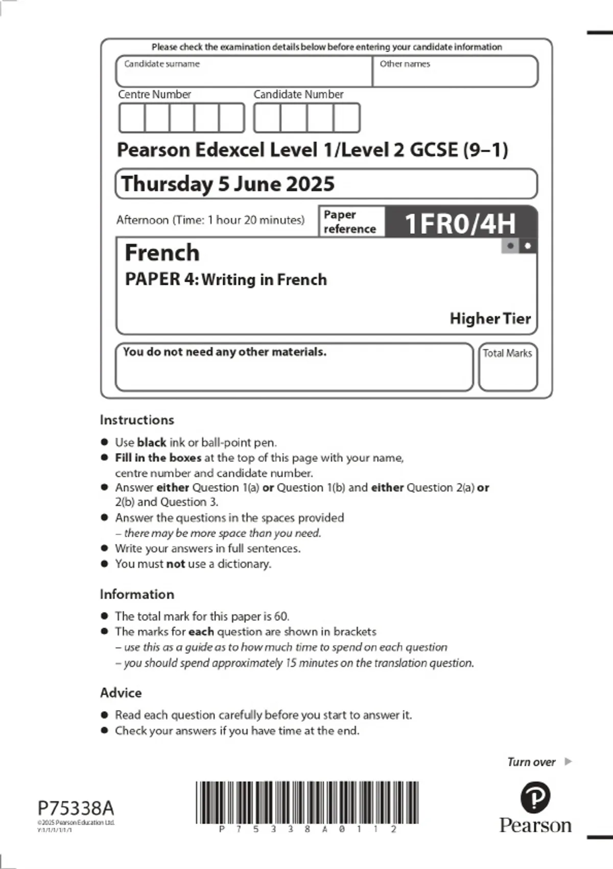 2025 Pearson Edexcel Level 1/Level 2 GCSE (9–1) French PAPER 4: Writing in French Higher Tier Combined Question Paper & Marking Scheme