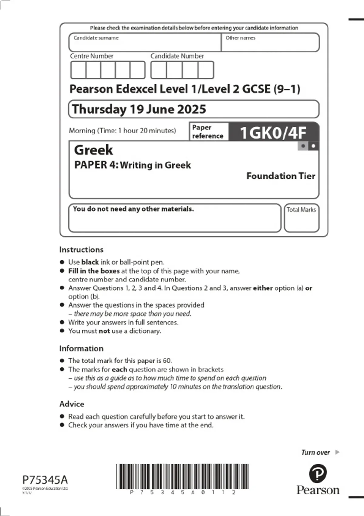2025 Pearson Edexcel Level 1/Level 2 GCSE (9–1) Greek PAPER 4: Writing in Greek Foundation Tier Combined Question Paper & Marking Scheme