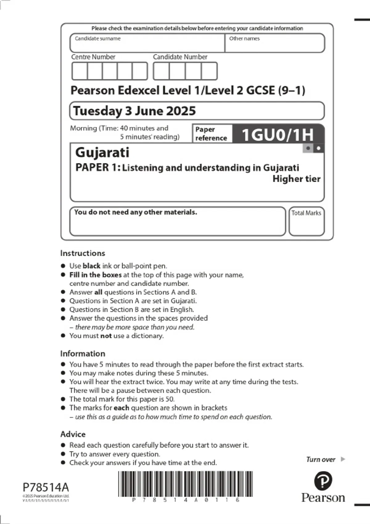 2025 Pearson Edexcel Level 1/Level 2 GCSE (9–1) Gujarati PAPER 1: Listening and understanding in Gujarati Higher tier Combined Question Paper & Marking Scheme
