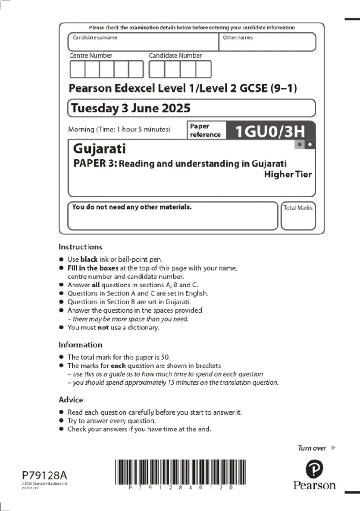 2025 Pearson Edexcel Level 1/Level 2 GCSE (9–1) Gujarati PAPER 3: Reading and understanding in Gujarati Higher Tier Combined Question Paper & Marking Scheme