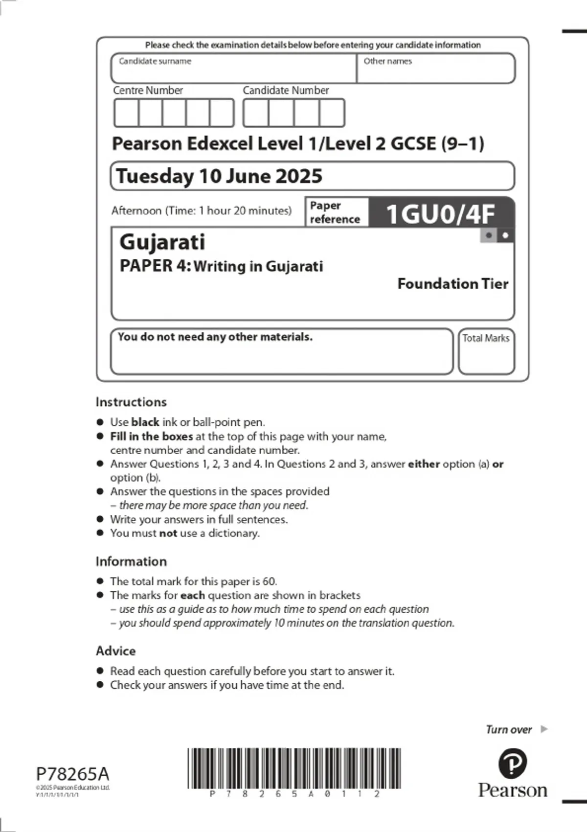 2025 Pearson Edexcel Level 1/Level 2 GCSE (9–1) Gujarati PAPER 4: Writing in Gujarati Foundation Tier Combined Question Paper & Marking Scheme