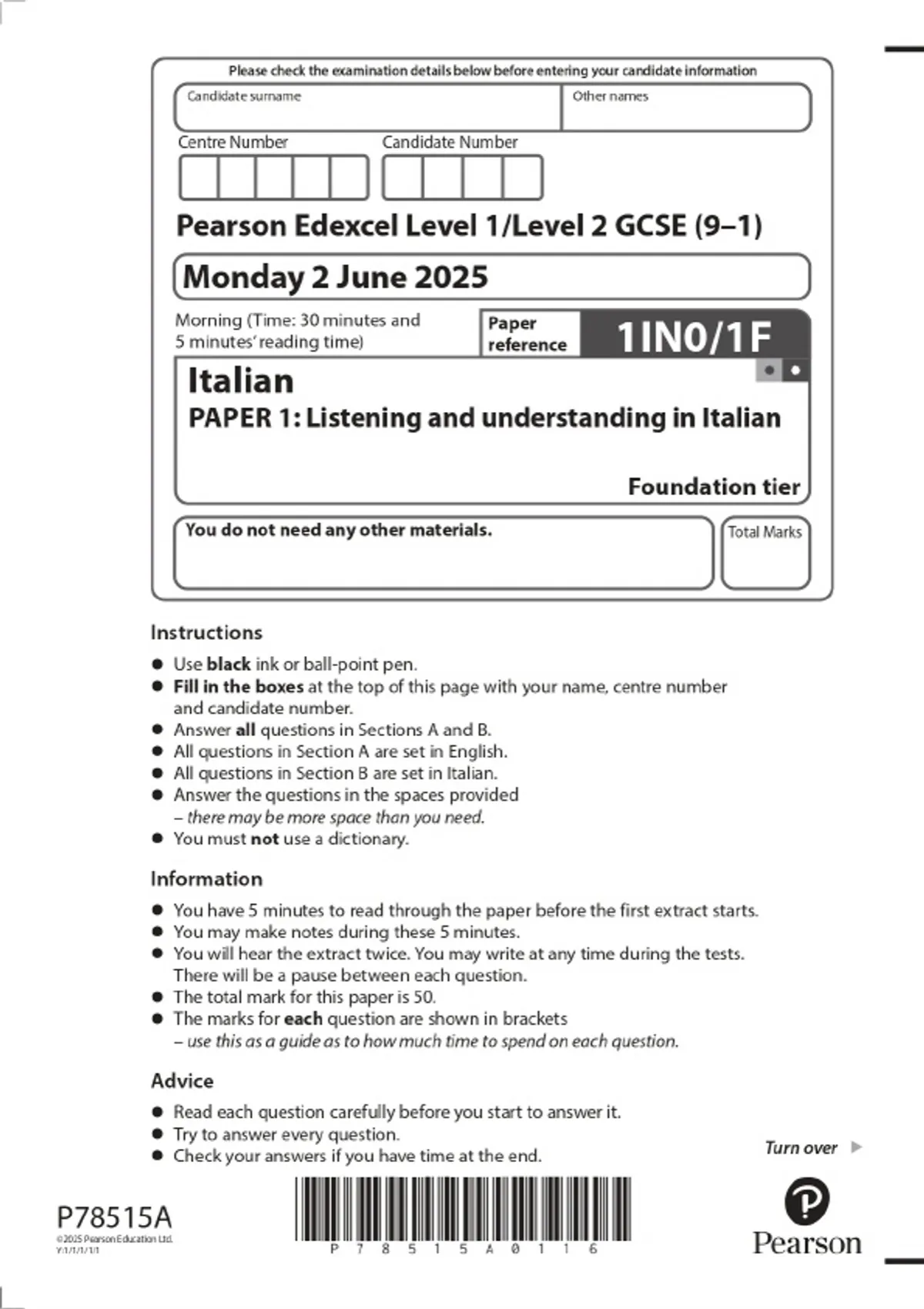 2025 Pearson Edexcel Level 1/Level 2 GCSE (9–1) Italian PAPER 1: Listening and understanding in Italian Foundation tier Combined Question Paper & Marking Scheme