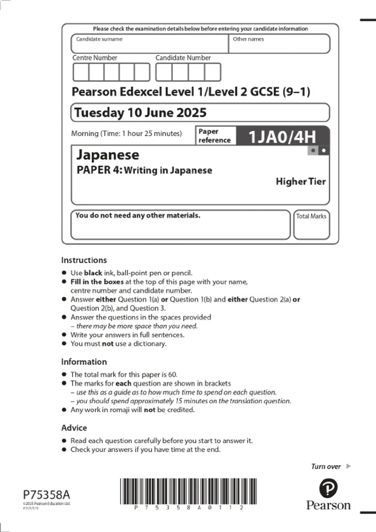 2025 Pearson Edexcel Level 1/Level 2 GCSE (9–1) Japanese PAPER 4: Writing in Japanese Higher Tier Combined Question Paper & Marking Scheme