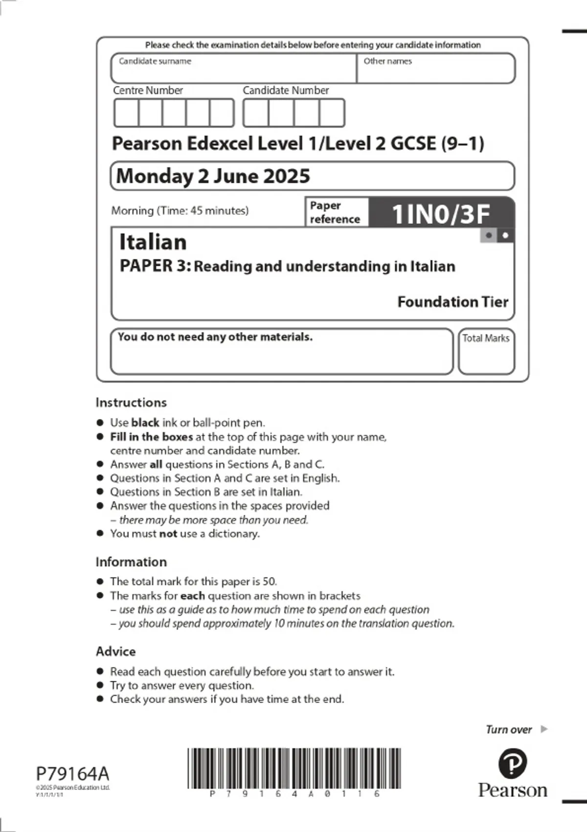 2025 Pearson Edexcel Level 1/Level 2 GCSE (9–1) Italian PAPER 3: Reading and understanding in Italian Foundation Tier Combined Question Paper & Marking Scheme