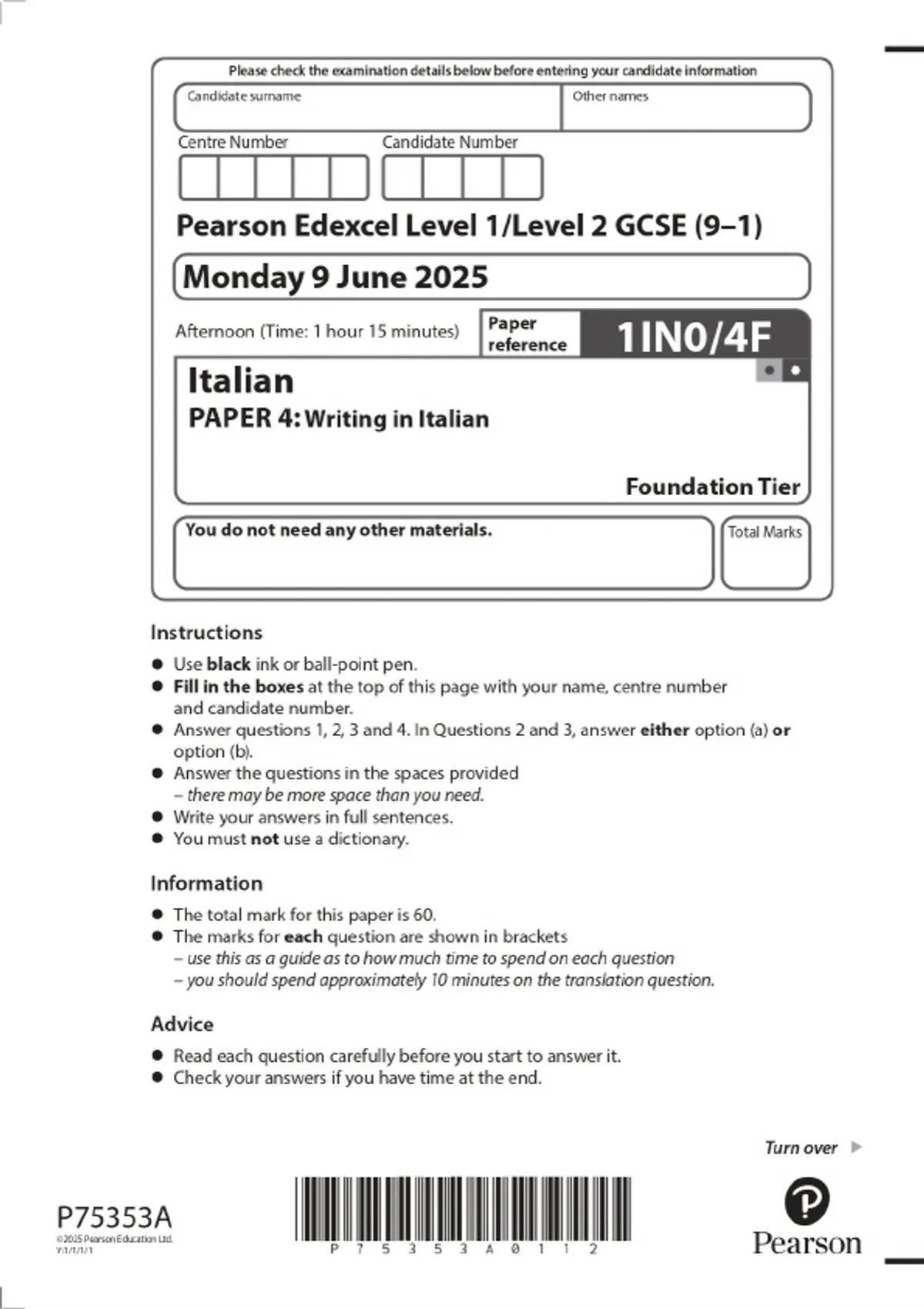2025 Pearson Edexcel Level 1/Level 2 GCSE (9–1) Italian PAPER 4: Writing in Italian Foundation Tier Combined Question Paper & Marking Scheme