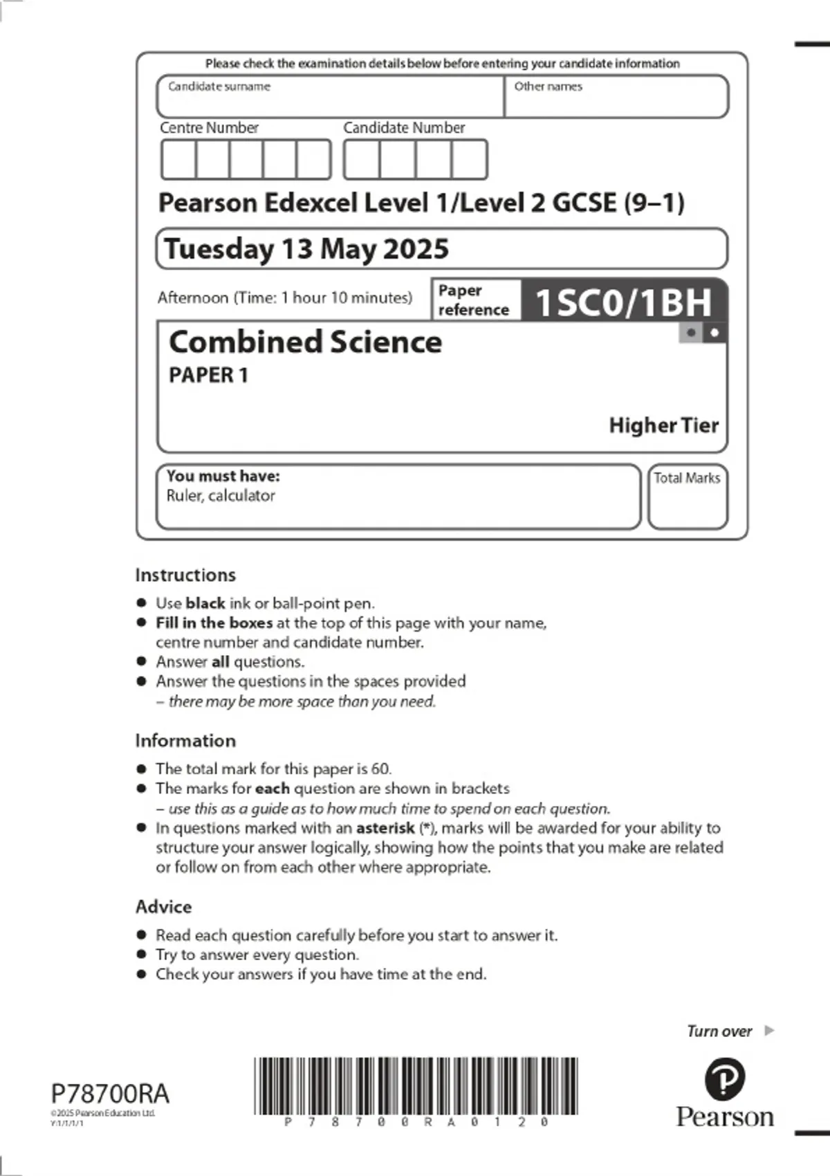 2025 Pearson Edexcel Level 1/Level 2 GCSE (9–1) Combined Science PAPER 1 Higher Tier Combined Question Paper and Final Marking Scheme