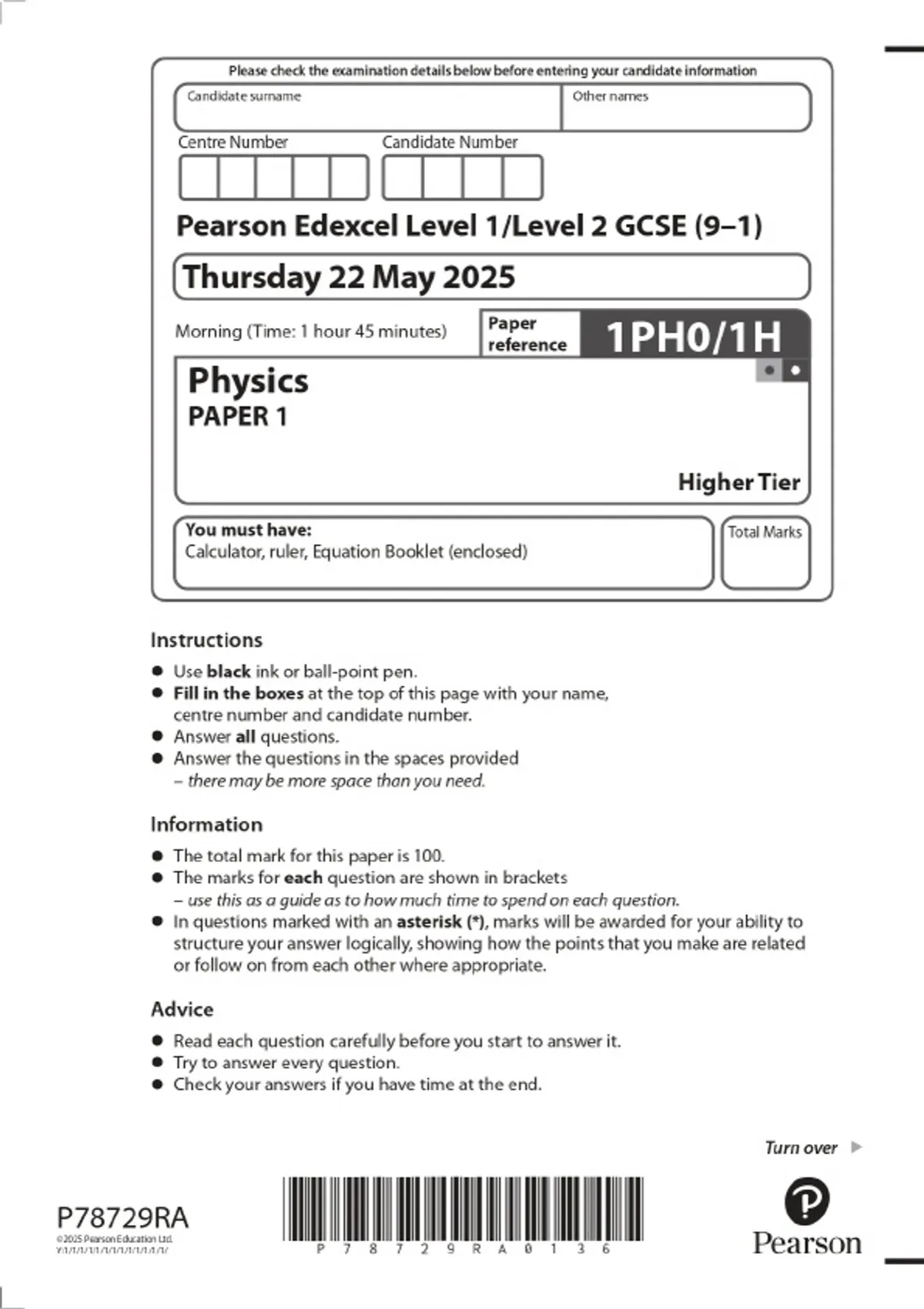 2025 Pearson Edexcel Level 1/Level 2 GCSE (9–1) Physics PAPER 1 Higher Tier Combined Question Paper and Final Marking Scheme