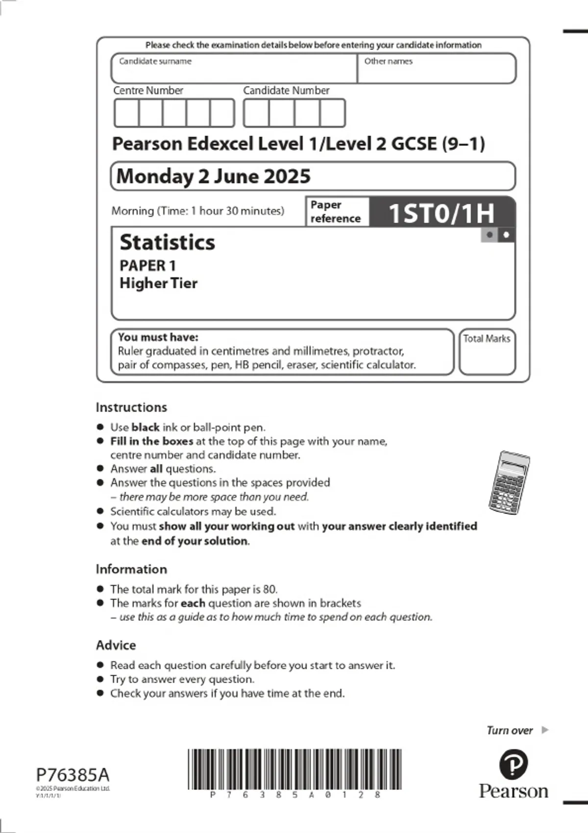 2025 Pearson Edexcel Level 1/level 2 GCSE (9-1) Statistics PAPER 1 Higher Tier Combined Question Paper and Final Marking Scheme