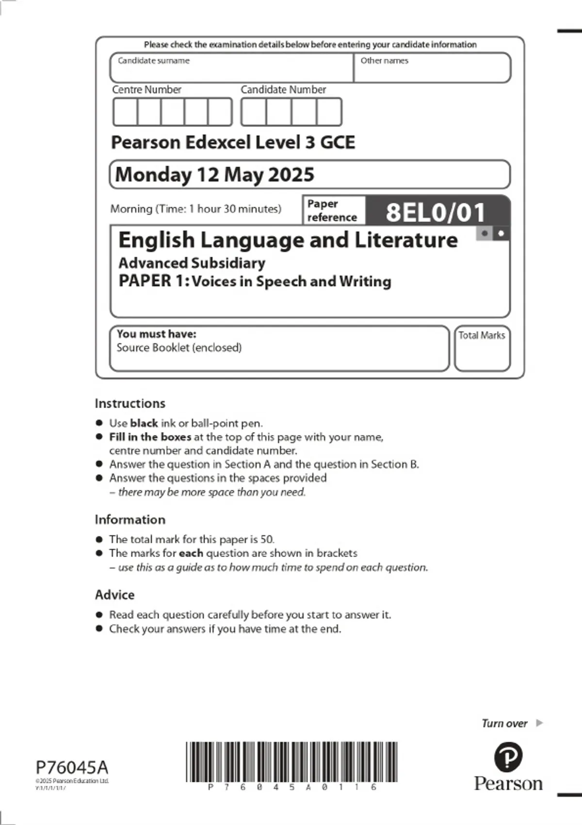 2025 Pearson Edexcel Level 3 GCE English Language and Literature Advanced Subsidiary PAPER 1: Voices in Speech and Writing Combined Question Paper & Final Marking Scheme
