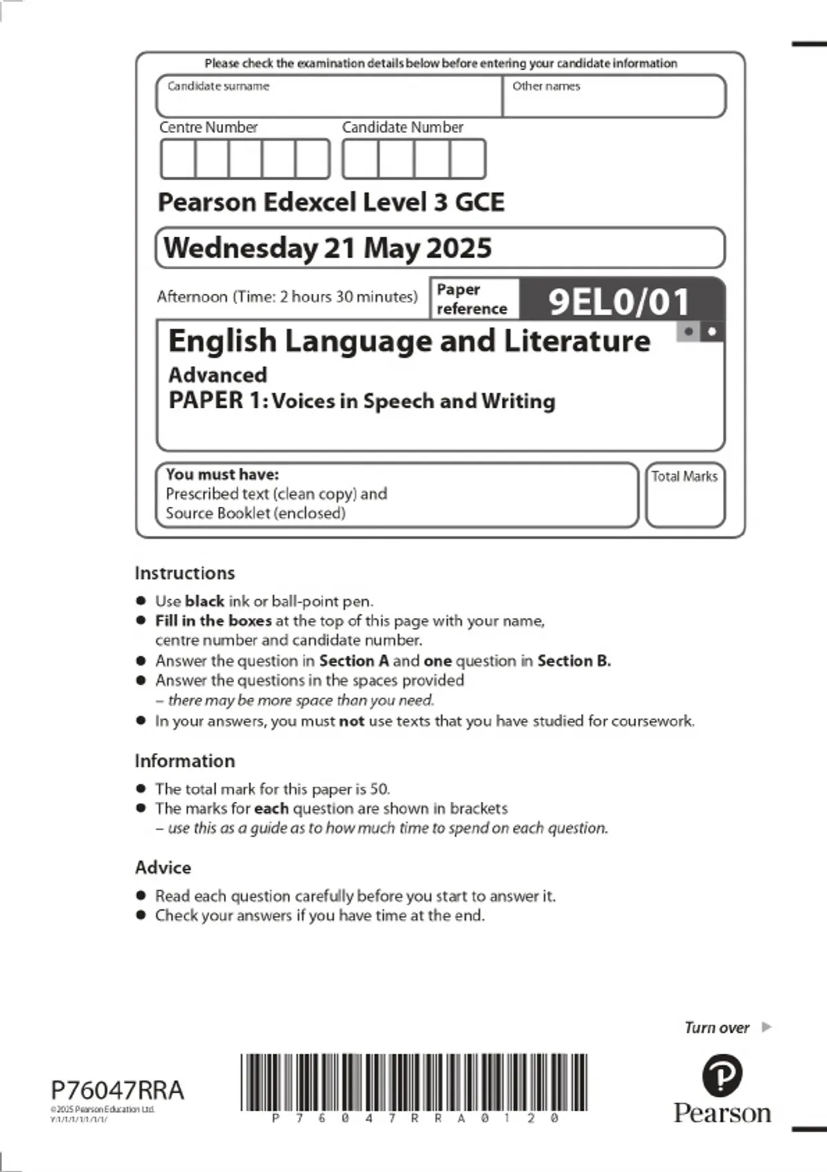 2025 Pearson Edexcel Level 3 GCE English Language and Literature Advanced PAPER 1: Voices in Speech and Writing Combined Question Paper & Final Marking Scheme
