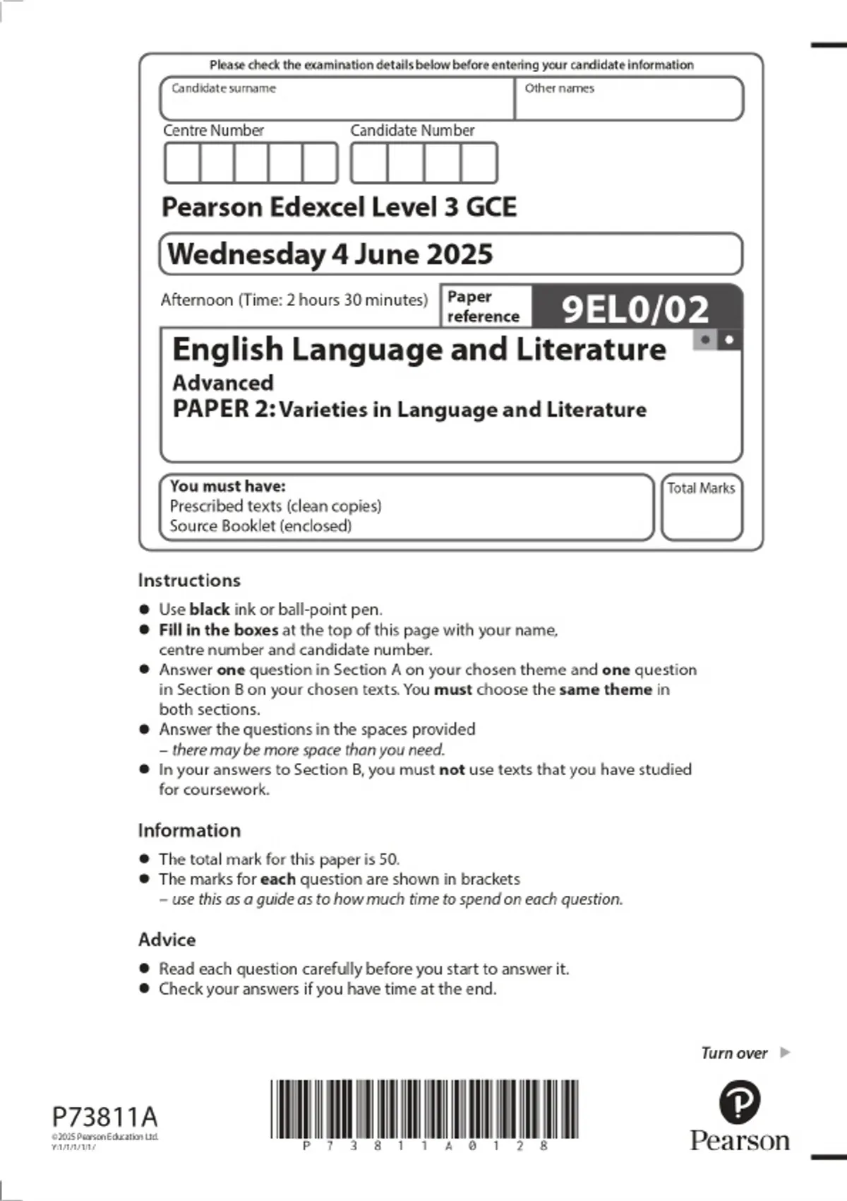 2025 Pearson Edexcel Level 3 GCE English Language and Literature Advanced PAPER 2: Varieties in Language and Literature Combined Question Paper & Final Marking Scheme