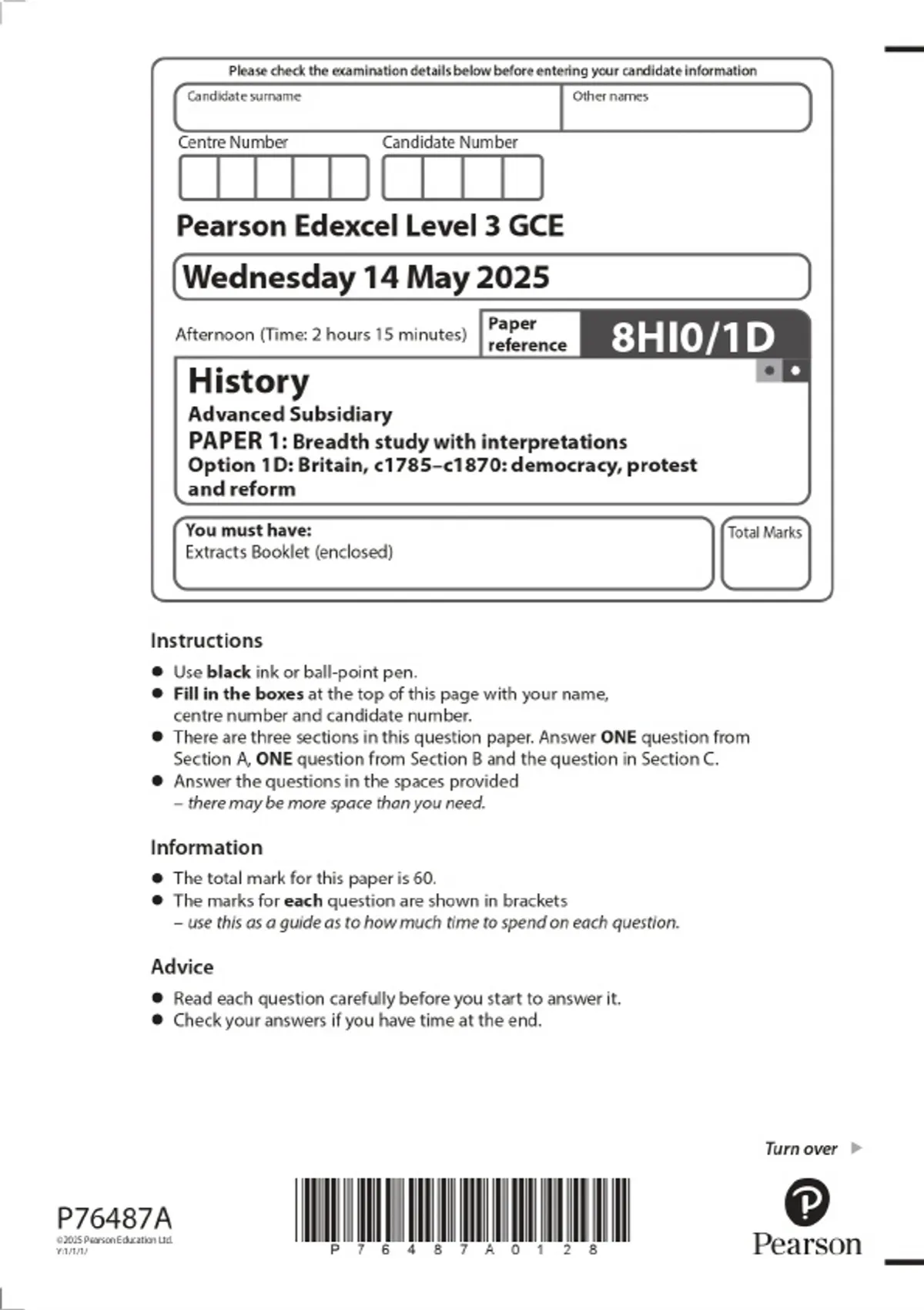 2025 Pearson Edexcel Level 3 GCE History Advanced Subsidiary PAPER 1: Breadth study with interpretations Option 1D: Britain, c1785–c1870: democracy, protest and reform Combined Question Paper & Final Marking Scheme