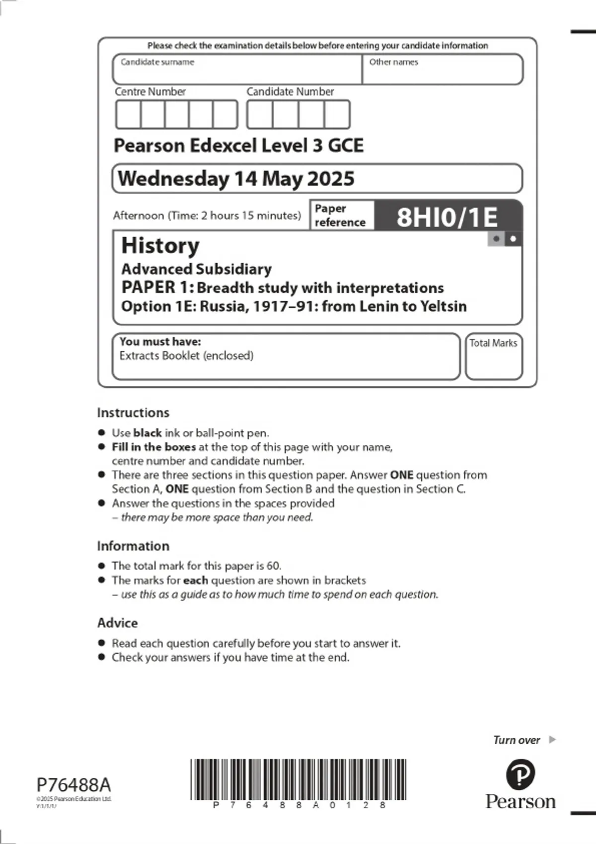2025 Pearson Edexcel Level 3 GCE History Advanced Subsidiary PAPER 1: Breadth study with interpretations Option 1E: Russia, 1917–91: from Lenin to Yeltsin Combined Question Paper & Final Marking Scheme