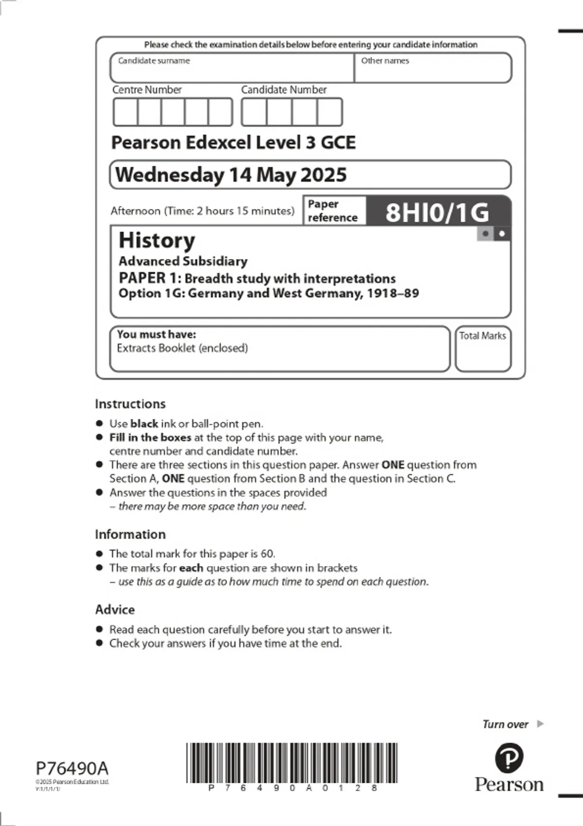 2025 Pearson Edexcel Level 3 GCE History Advanced Subsidiary PAPER 1: Breadth study with interpretations Option 1G: Germany and West Germany, 1918–89 Combined Question Paper & Final Marking Scheme