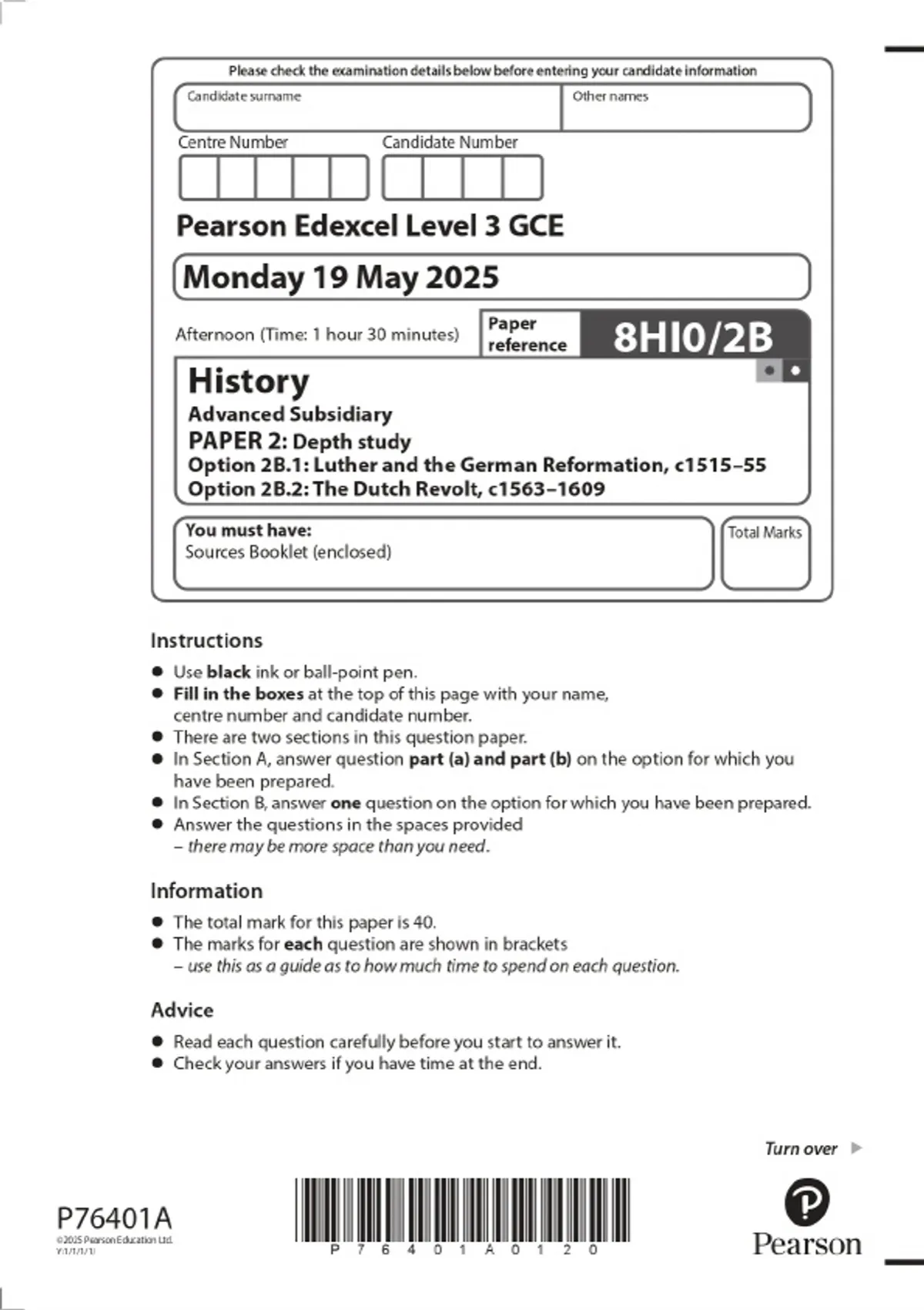 2025 Pearson Edexcel Level 3 GCE History Advanced Subsidiary PAPER 2: Depth study Option 2B.1: Luther and the German Reformation, c1515–55 Option 2B.2: The Dutch Revolt, c1563–1609 Combined Question Paper & Final Marking Scheme