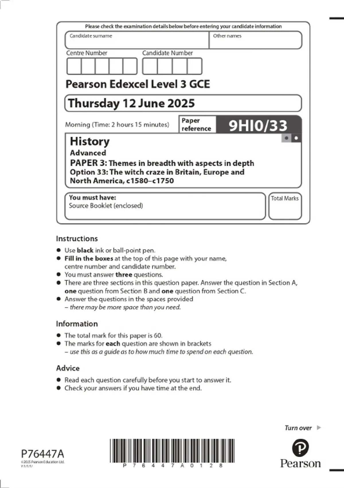 2025 Pearson Edexcel Level 3 GCE History Advanced PAPER 3: Themes in breadth with aspects in depth Option 33: The witch craze in Britain, Europe and North America, c1580–c1750 Combined Question Paper & Final Marking Scheme