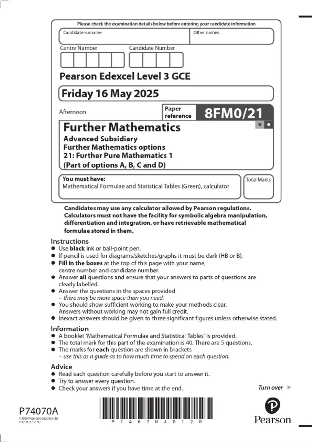 2025 Pearson Edexcel Level 3 GCE Further Mathematics Advanced Subsidiary Further Mathematics options 21: Further Pure Mathematics 1 (Part of options A, B, C and D) Combined Question Paper & Final Marking Scheme