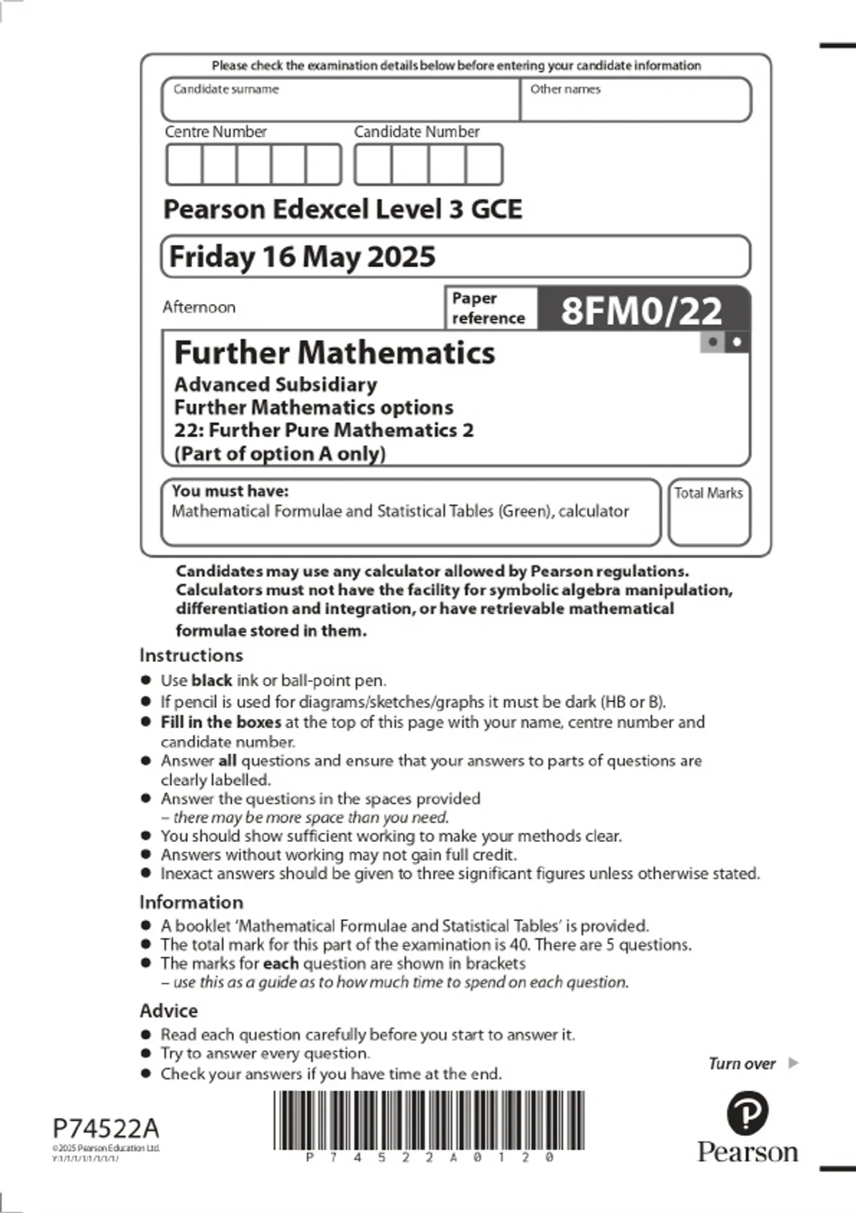2025 Pearson Edexcel Level 3 GCE Further Mathematics Advanced Subsidiary Further Mathematics options 22: Further Pure Mathematics 2 (Part of option A only) Combined Question Paper & Final Marking Scheme