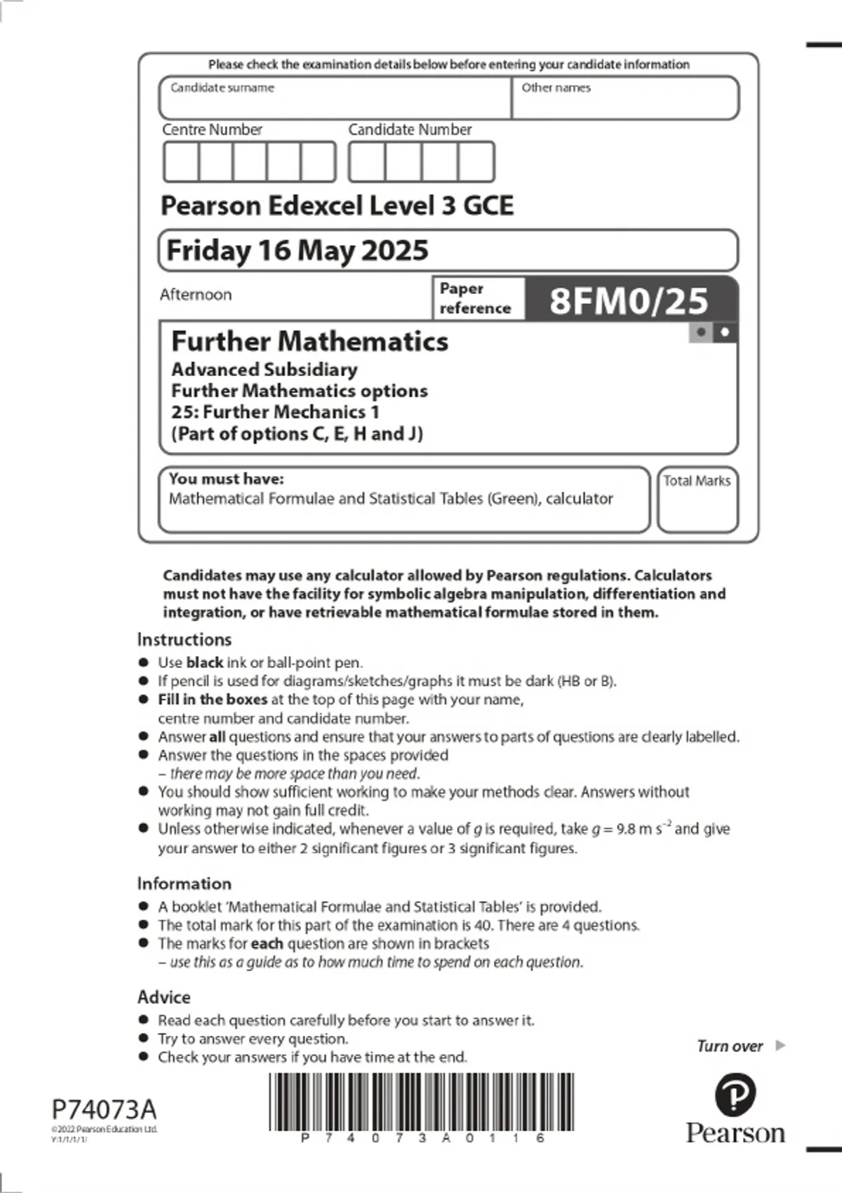 2025 Pearson Edexcel Level 3 GCE Further Mathematics Advanced Subsidiary Further Mathematics options 25: Further Mechanics 1 (Part of options C, E, H and J) Combined Question Paper & Final Marking Scheme
