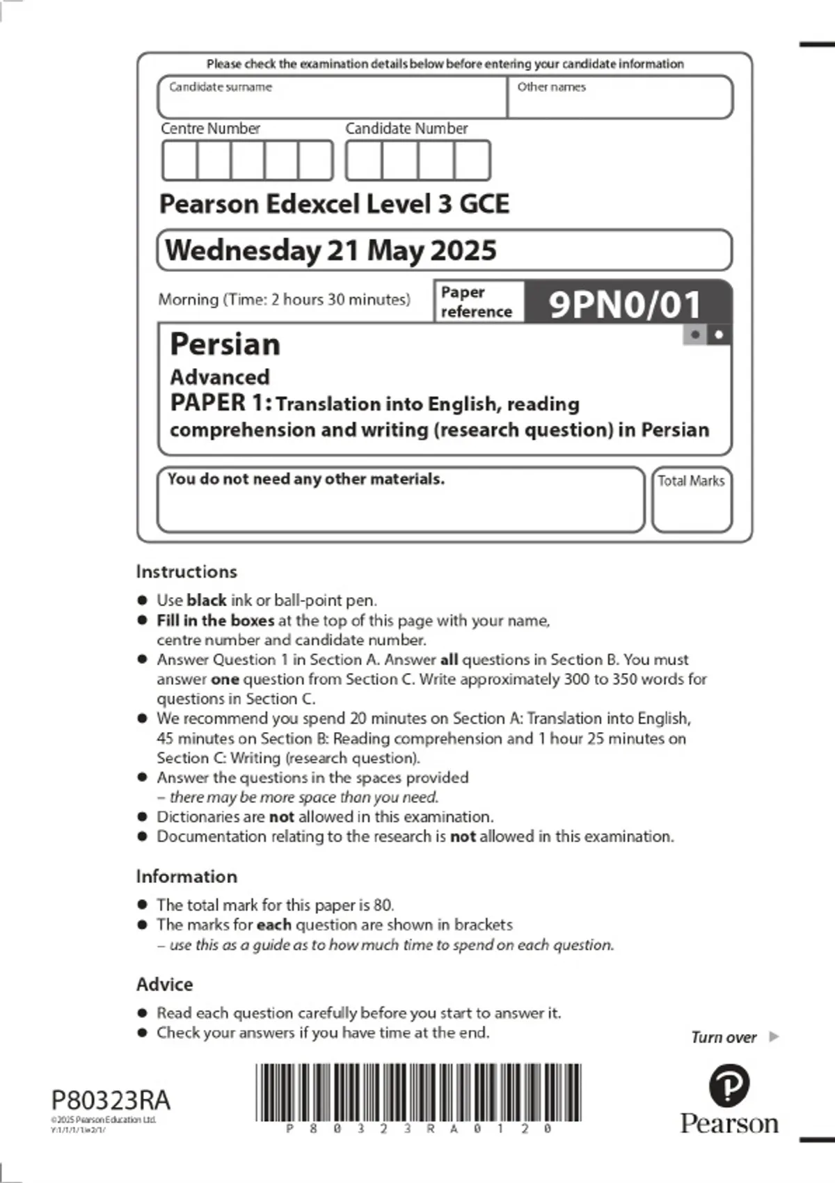 2025 Pearson Edexcel Level 3 GCE Persian Advanced PAPER 1: Translation into English, reading comprehension and writing (research question) in Persian Combined Question Paper & Final Marking Scheme