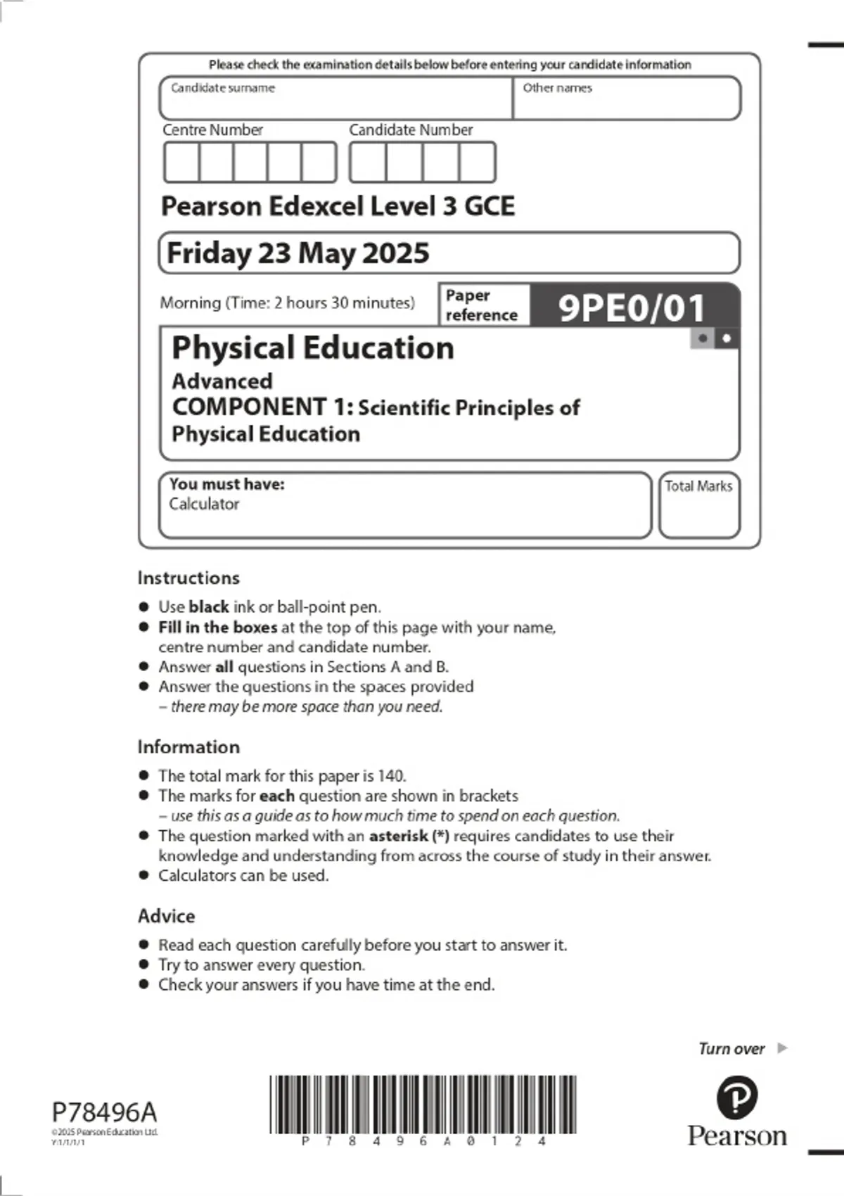 2025 Pearson Edexcel Level 3 GCE Physical Education Advanced COMPONENT 1: Scientific Principles of Physical Education Combined Question Paper & Final Marking Scheme