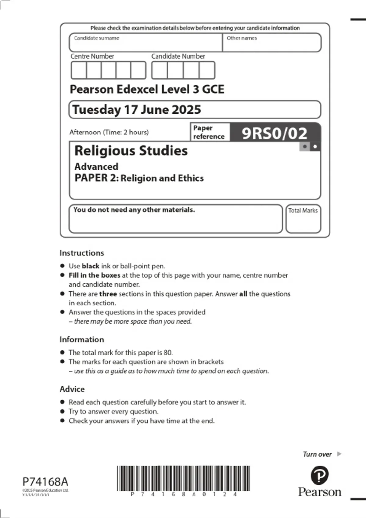 2025 Pearson Edexcel Level 3 GCE Religious Studies Advanced PAPER 2: Religion and Ethics Combined Question Paper & Final Marking Scheme