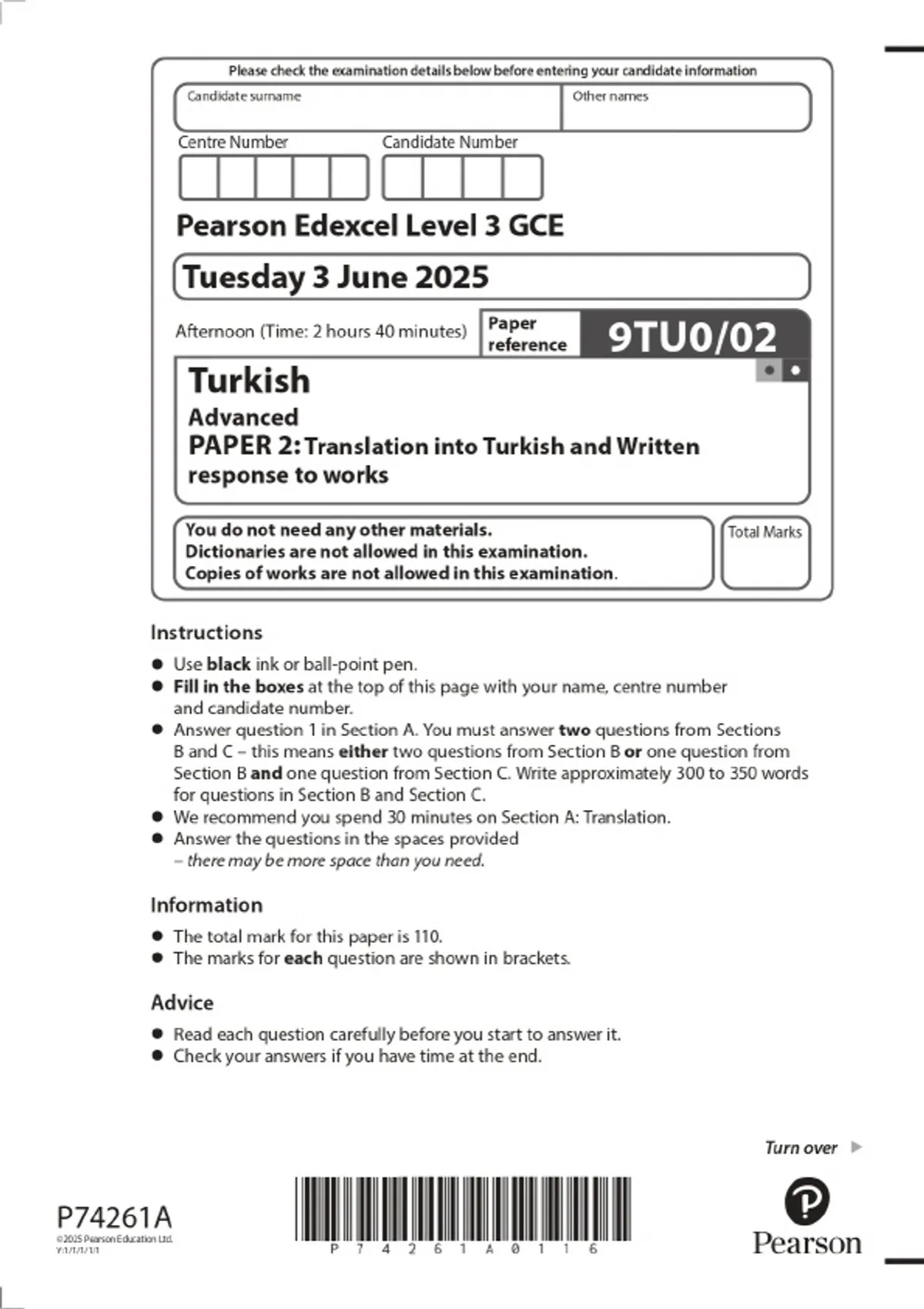 2025 Pearson Edexcel Level 3 GCE Turkish Advanced PAPER 2: Translation into Turkish and Written response to works Combined Question Paper & Final Marking Scheme
