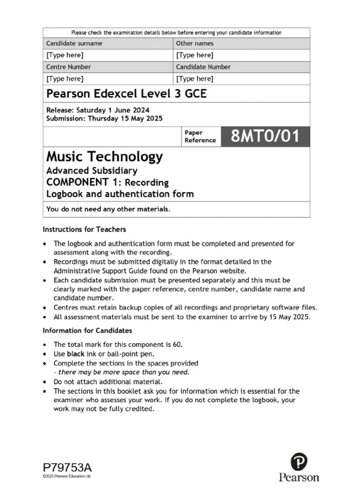 2025 Pearson Edexcel Level 3 GCE Music Technology Advanced Subsidiary COMPONENT 1: Recording Combined Question Paper & Final Marking Scheme