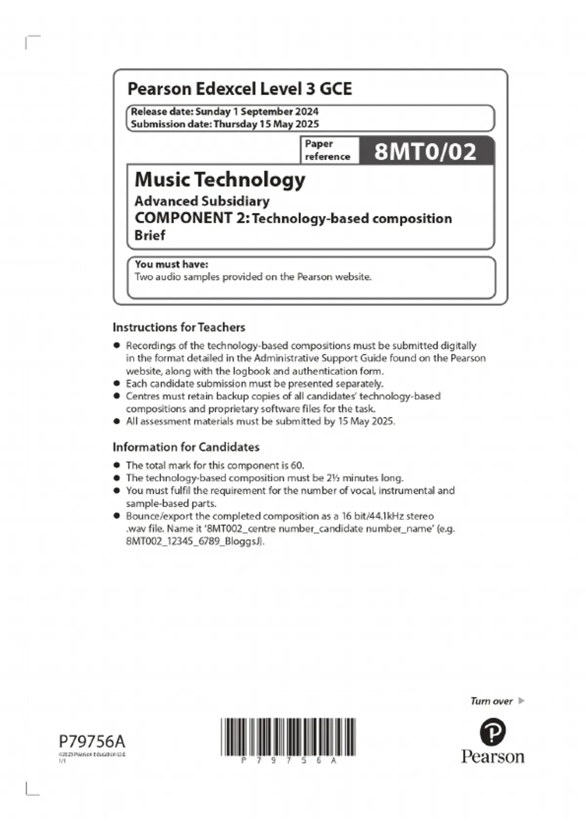 2025 Pearson Edexcel Level 3 GCE Music Technology Advanced Subsidiary COMPONENT 2: Technology based composition Brief Combined Question Paper & Final Marking Scheme