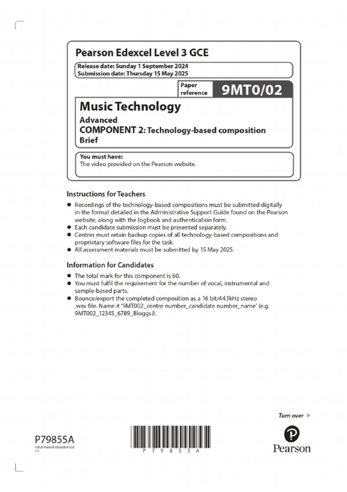 2025 Pearson Edexcel Level 3 GCE Music Technology Advanced COMPONENT 2: Technology-based composition Brief Combined Question Paper & Final Marking Scheme