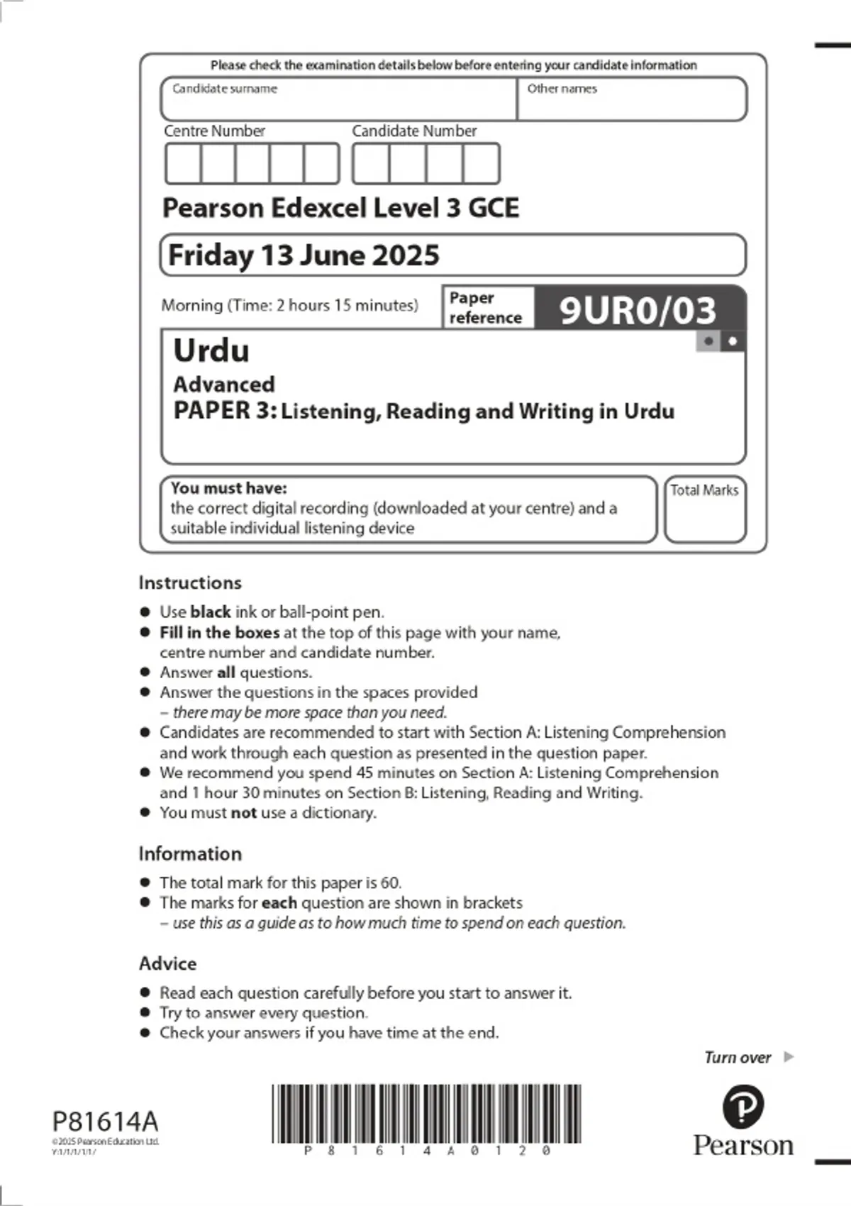 2025 Pearson Edexcel Level 3 GCE Urdu Advanced PAPER 3: Listening, Reading and Writing in Urdu Combined Question Paper & Final Marking Scheme