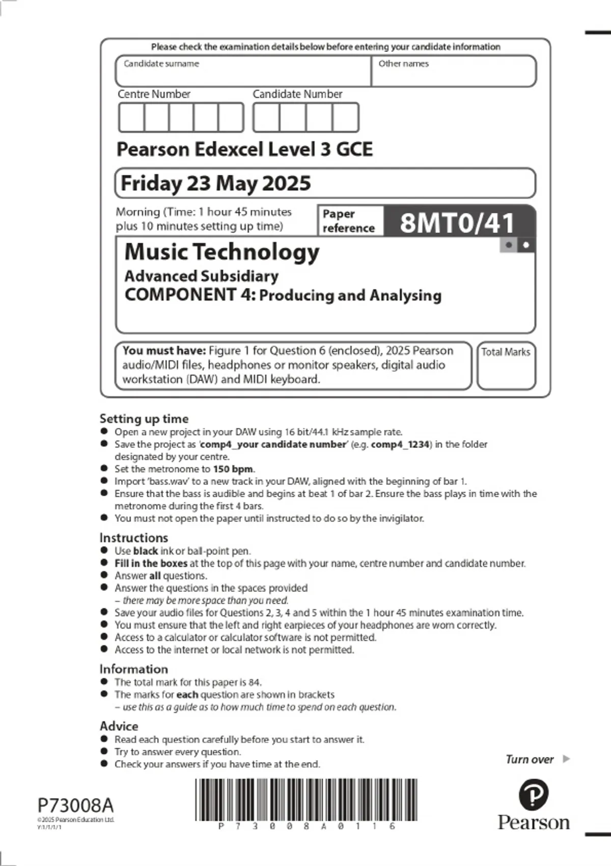 2025 Pearson Edexcel Level 3 GCE Music Technology Advanced Subsidiary COMPONENT 4: Producing and Analysing Combined Question Paper & Final Marking Scheme