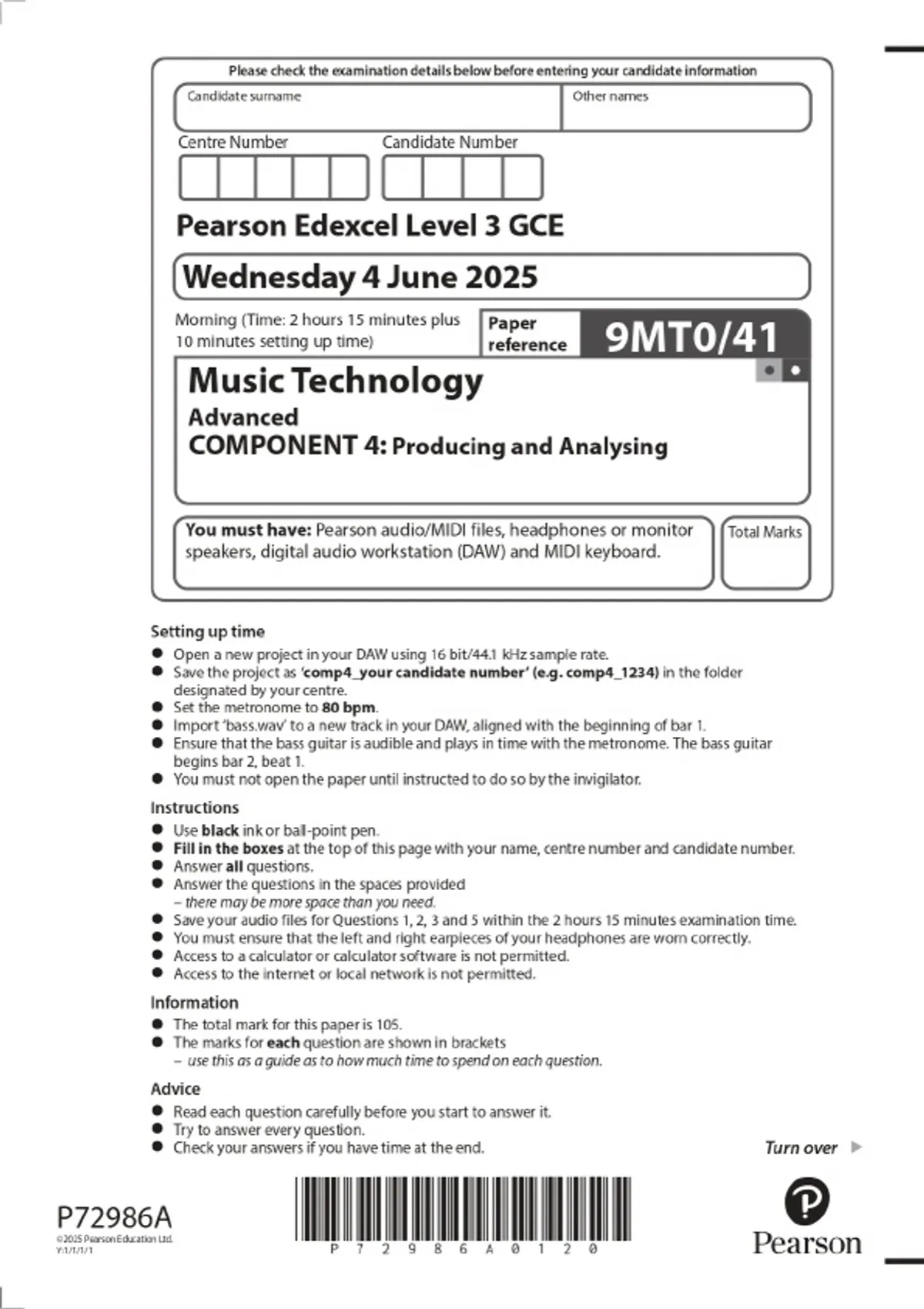 2025 Pearson Edexcel Level 3 Music Technology Advanced COMPONENT 4: Producing and Analysing Combined Question Paper & Final Marking Scheme