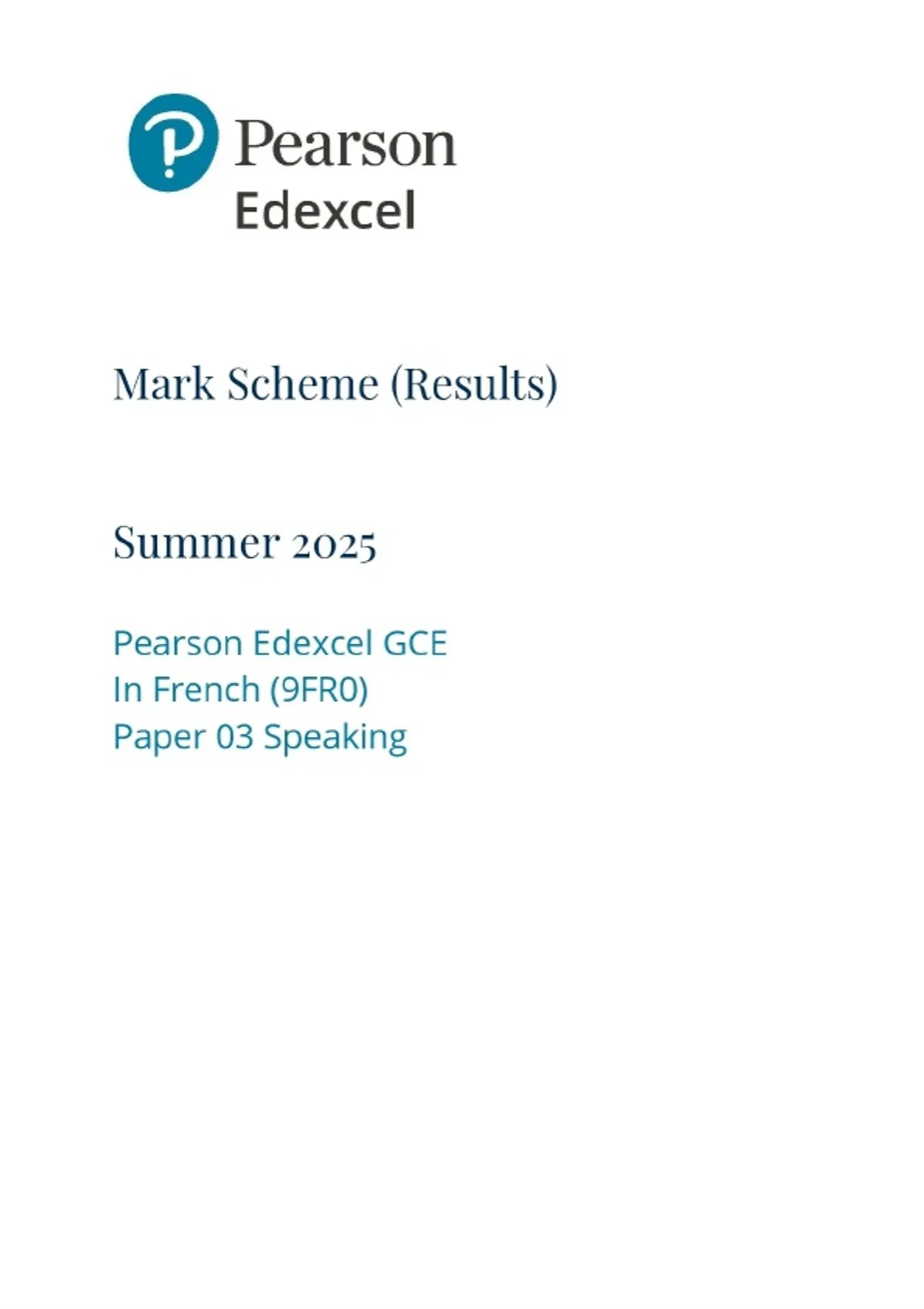 2025 Pearson Edexcel GCE In French (9FR0) Paper 03 Speaking Marking Scheme