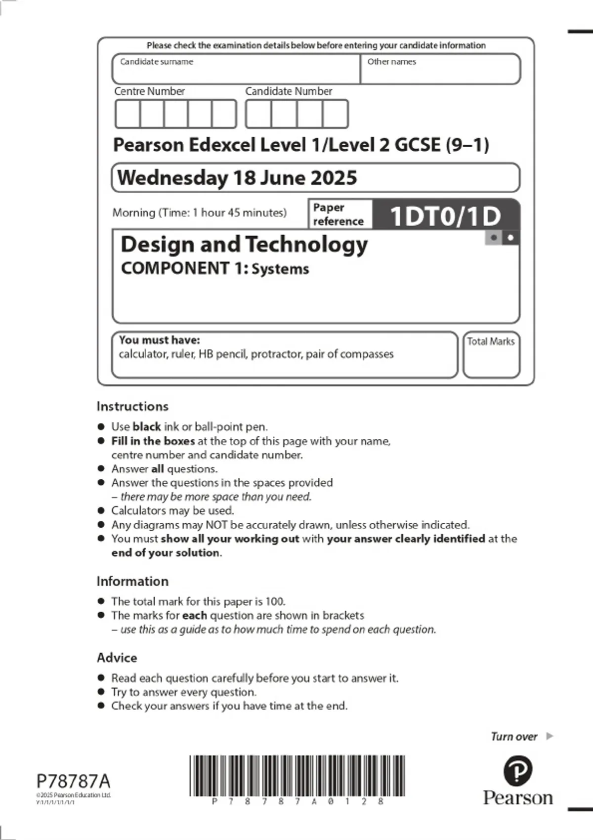 2025 Pearson Edexcel Level 1/Level 2 GCSE (9–1) Design and Technology COMPONENT 1: Systems Combined Question Paper & Marking Scheme