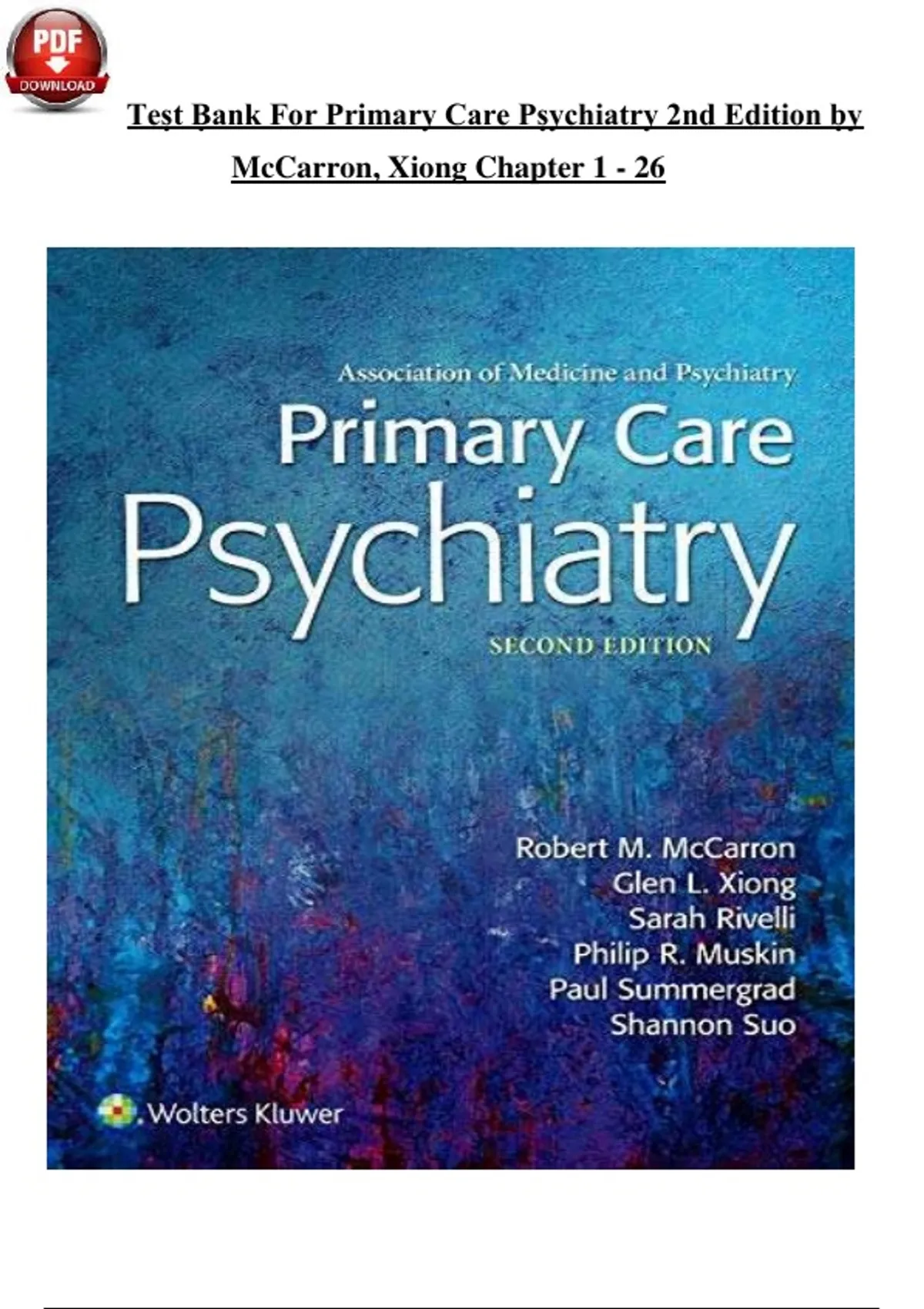 Test Bank For Primary Care Psychiatry 2nd Edition by Robert McCarron, Glen Xiong Chapter 1 - 26