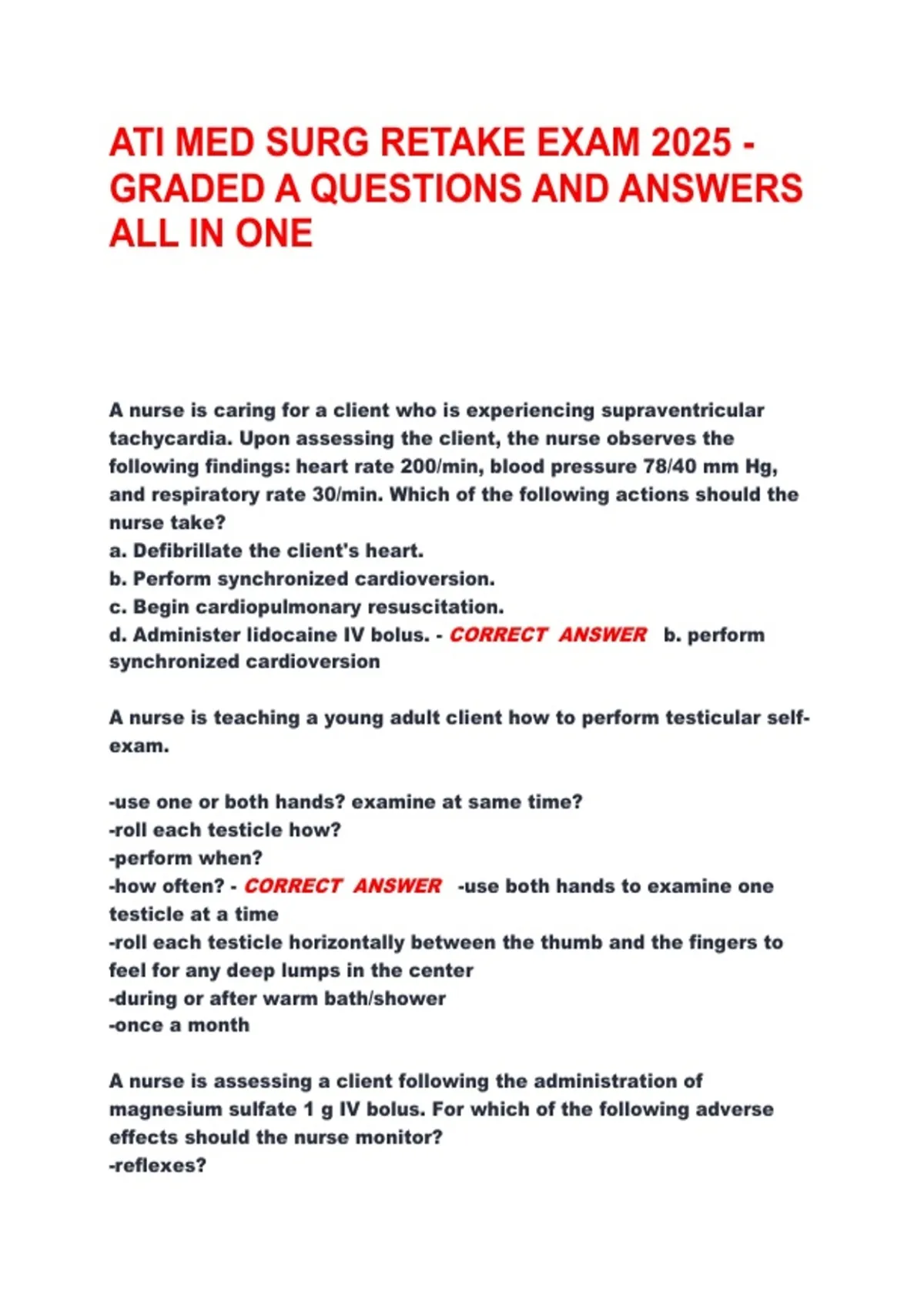 Prepare for the ATI Med Surg Retake Exam 2025 with this all-in-one guide with solution, featuring Graded A questions and answers designed to strengthen medical-surgical nursing knowledge, reinforce key concepts, and boost exam performance.