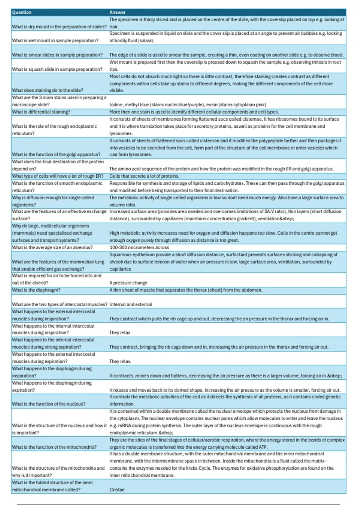 surface? distance), surrounded by capillaries (maintains concentration gradient), ventilation