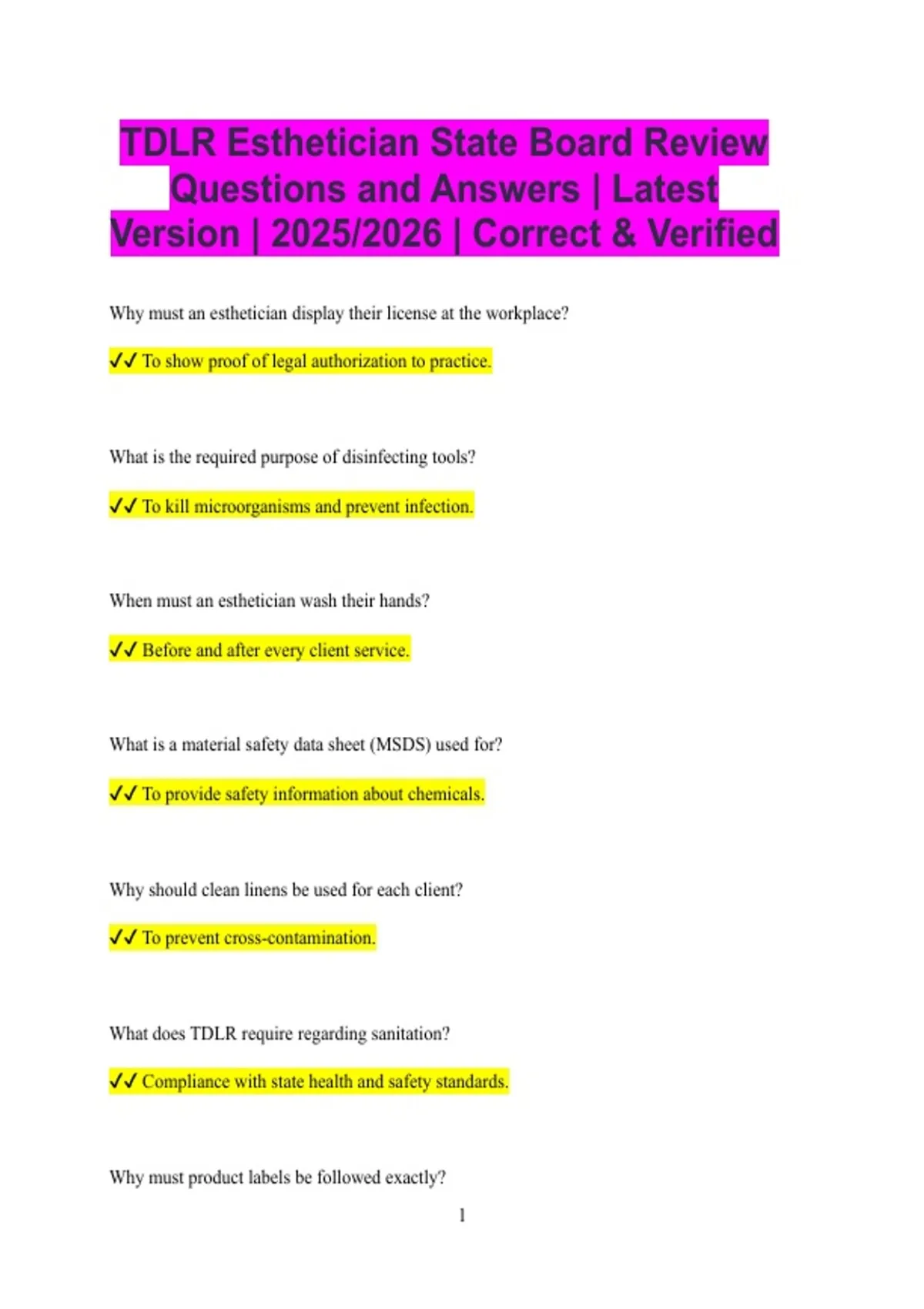 TDLR Esthetician State Board Review Questions and Answers | Latest Version | 2025/2026 | Correct & Verified Why must an esthetician display their license at the workplace? To show proof of legal authorization to practice. What is the required purpose of disinfecting tools? To kill microorganisms and prevent infection. When must an esthetician wash their hands? Before and after every client service. What is a material safety data sheet (MSDS) used for? To provide safety information about chemicals. Why should clean linens be used for each client? To prevent cross-contamination. What does TDLR require regarding sanitation? Compliance with state health and safety standards. Why must product labels be followed exactly? 2 To ensure client safety and proper results. What is a universal precaution? Treating all body fluids as potentially infectious. Why must trash be removed daily from the treatment room? To maintain sanitation and prevent odors. What is the main purpose of a client intake form? To record health history and skin concerns. Why must wax temperature be controlled? To prevent skin burns. What is a disinfectant? A chemical that kills bacteria on tools. Why must estheticians avoid working when ill? To prevent spreading disease. What does “scope of practice” mean? The legal services an esthetician can perform. 3 Why must clean gloves be worn during extractions? To protect both client and esthetician. What is the purpose of proper ventilation? To maintain air quality and safety. Why must sharp tools be disposed of in sharps containers? To prevent injury and infection. What is considered professional misconduct? Violating state rules or ethical standards. Why must clean towels be stored in closed cabinets? To protect them from contamination. What is an infection? Invasion of the body by harmful organisms. Why should alcohol be used carefully on the skin? It can cause dryness and irritation. 4 What does “sanitizing” mean? Reducing bacteria to safe levels. Why must estheticians refuse service to clients with contagious conditions? To protect public health. What is a contraindication in esthetics? A condition that makes treatment unsafe. Why must wax applicators be single-use? To prevent double-dipping