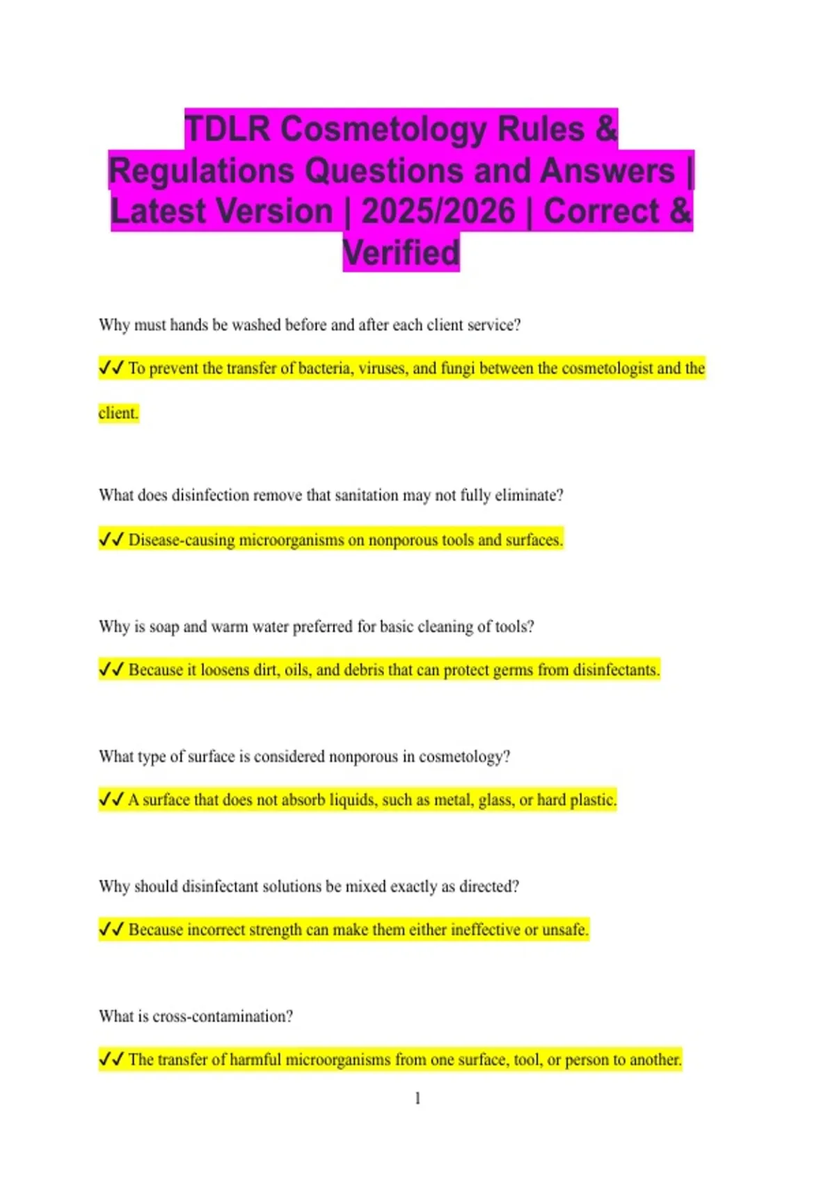TDLR Cosmetology Rules & Regulations Questions and Answers | Latest Version | 2025/2026 | Correct & Verified Why must hands be washed before and after each client service? To prevent the transfer of bacteria, viruses, and fungi between the cosmetologist and the client. What does disinfection remove that sanitation may not fully eliminate? Disease-causing microorganisms on nonporous tools and surfaces. Why is soap and warm water preferred for basic cleaning of tools? Because it loosens dirt, oils, and debris that can protect germs from disinfectants. What type of surface is considered nonporous in cosmetology? A surface that does not absorb liquids, such as metal, glass, or hard plastic. Why should disinfectant solutions be mixed exactly as directed? Because incorrect strength can make them either ineffective or unsafe. What is cross-contamination? The transfer of harmful microorganisms from one surface, tool, or person to another. 2 Why must tools be cleaned before being disinfected? Because dirt and residue can block the disinfectant from killing germs. What is the safest way to store clean tools? In a clean, closed, and labeled container. Why should towels used on clients never be reused without laundering? Because they can carry skin cells, oils, and microorganisms. What does an EPA-registered disinfectant mean? It has been tested and approved to kill specific microorganisms. Why should gloves be worn during certain services? To protect both the cosmetologist and the client from exposure to blood or body fluids. What is the purpose of a Safety Data Sheet (SDS)? To provide information about chemical hazards and safe handling. Why must spills be cleaned immediately in the salon? To prevent slips, falls, and the spread of germs. 3 What is a single-use item in cosmetology? An item designed to be used once and then discarded. Why should razors never be reused without proper disinfection? Because they can transmit bloodborne pathogens. What is the correct way to handle a tool dropped on the floor? Clean and disinfect it before using it again. Why should food and drinks be kept out of service areas? To avoid contamination of tools and products. What does “contact time” mean for disinfectants? The amount of time a surface or tool must stay wet to be effective. Why is proper ventilation important when using chemicals? To reduce inhalation of harmful fumes. What is the purpose of using an antiseptic on minor cuts? To prevent infection by killing or slowing germ growth. Why should broken skin be avoided during services? 4 Because it increases the risk of infection. What is a blood spill procedure? A set of steps to safely clean and disinfect areas contaminated with blood. Why must salon waste be disposed of properly? To prevent odors, pests, and disease spread. What does “universal precautions” mean? Treating all blood and body fluids as potentially infectious. Why should electrical tools be checked regularly? To prevent shocks, burns, and fires. What is a porous item in cosmetology?
