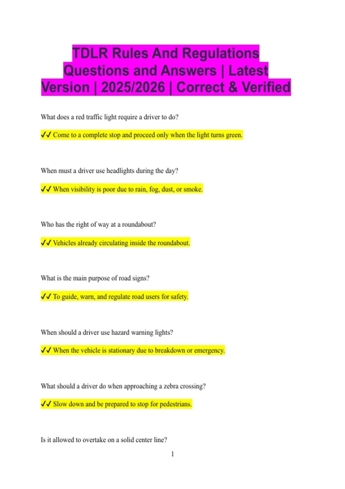 TDLR Rules And Regulations Questions and Answers | Latest Version | 2025/2026 | Correct & Verified What does a red traffic light require a driver to do? Come to a complete stop and proceed only when the light turns green. When must a driver use headlights during the day? When visibility is poor due to rain, fog, dust, or smoke. Who has the right of way at a roundabout? Vehicles already circulating inside the roundabout. What is the main purpose of road signs? To guide, warn, and regulate road users for safety. When should a driver use hazard warning lights? When the vehicle is stationary due to breakdown or emergency. What should a driver do when approaching a zebra crossing? Slow down and be prepared to stop for pedestrians. Is it allowed to overtake on a solid center line? 2 No, overtaking is prohibited on a solid line. What must a driver do before changing lanes? Check mirrors, signal, and ensure the lane is clear. What does a flashing yellow traffic light mean? Proceed with caution and be alert. When is it illegal to use a mobile phone while driving? When it is handheld and distracts from driving. What document must a driver always carry while driving? A valid driving licence. What is the safest following distance in normal conditions? At least two seconds behind the vehicle ahead. What should a driver do at a stop sign? Stop completely and give way before proceeding. Who is responsible for ensuring passengers wear seat belts? The driver. 3 When should a driver use the horn? Only to warn others of danger. What does a triangular warning sign usually indicate? A hazard or danger ahead. Is driving under the influence of alcohol allowed? No, it is strictly prohibited. What should a driver do if an ambulance approaches with sirens on? Pull over safely and give way. When can a driver overtake from the left side? When the vehicle ahead is turning right. What is the purpose of a speed limit sign? To show the maximum legal speed for that road. What should a driver do if traffic lights are not working? Follow road signs or police officer directions. 4 When must a child use a child restraint or car seat? When required by law based on age or height. What does a continuous yellow edge line mean? Do not stop or park there. What is the first action after a road accident? Stop and ensure safety. What should a driver do if brakes fail? Shift to a lower gear and apply the handbrake gradually. When is overtaking prohibited near a junction? Always, for safety reasons. What does a circular blue sign usually indicate? A mandatory instruction. What should a driver do when approaching a railway crossing? Slow down, look both ways, and stop if a train is coming. What is the main function of road markings? 5 To guide traffic movement. What should a driver do if feeling sleepy while driving? Stop and rest before continuing. When is it illegal to park on the roadside?