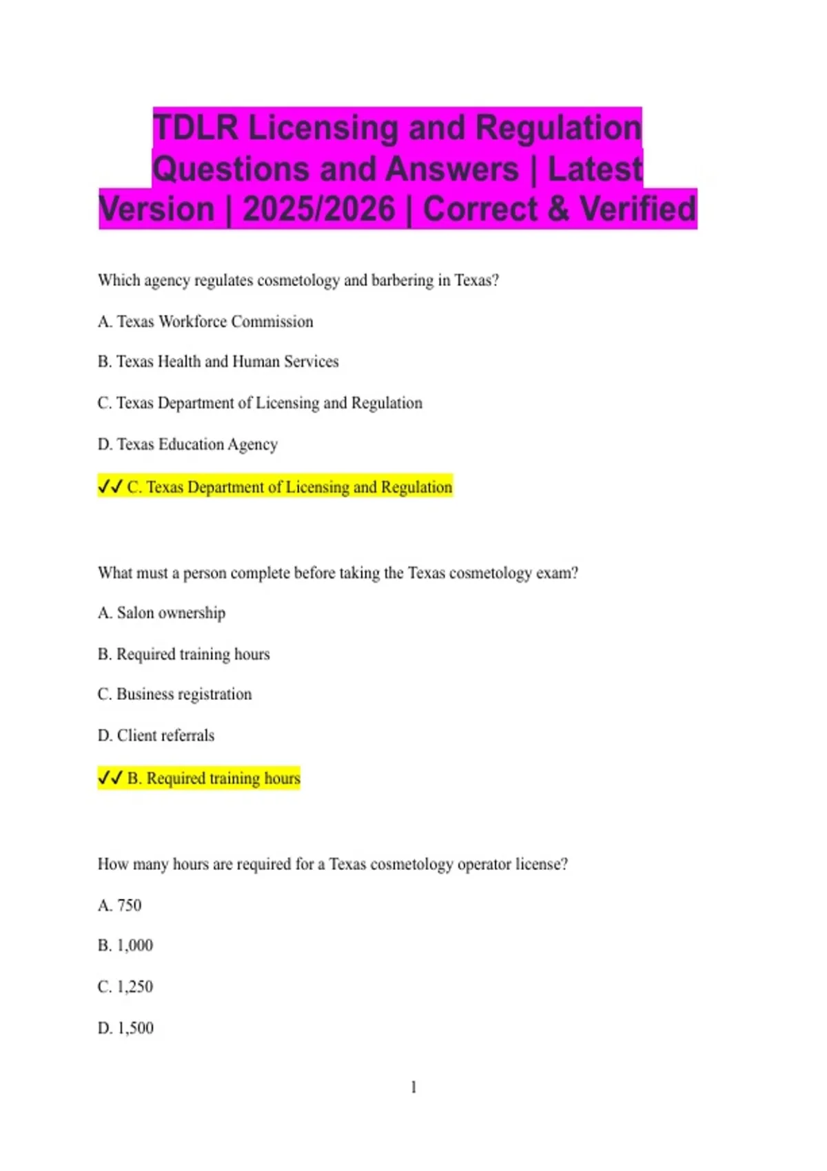TDLR Licensing and Regulation Questions and Answers | Latest Version | 2025/2026 | Correct & Verified Which agency regulates cosmetology and barbering in Texas? A. Texas Workforce Commission B. Texas Health and Human Services C. Texas Department of Licensing and Regulation D. Texas Education Agency C. Texas Department of Licensing and Regulation What must a person complete before taking the Texas cosmetology exam? A. Salon ownership B. Required training hours C. Business registration D. Client referrals B. Required training hours How many hours are required for a Texas cosmetology operator license? A. 750 B. 1,000 C. 1,250 D. 1,500 2 D. 1,500 Which license allows a person to legally operate a beauty salon in Texas? A. Instructor license B. Salon license C. Operator license D. Retail license B. Salon license Who must hold a license to provide hair-cutting services for pay? A. Any adult B. Students only C. Licensed professionals D. Salon owners only C. Licensed professionals Why does TDLR conduct salon inspections? A. To collect fees B. To enforce dress codes C. To ensure safety and sanitation D. To approve new styles C. To ensure safety and sanitation 3 How often must a Texas cosmetology license be renewed? A. Every year B. Every two years C. Every three years D. Every five years B. Every two years What happens if a license expires and is not renewed? A. It renews automatically B. It becomes permanent C. Late fees may apply D. It transfers to another person C. Late fees may apply Which service requires a specialty license in Texas? A. Shampooing B. Hair braiding C. Makeup sales D. Wig styling B. Hair braiding What document proves a salon is legally approved to operate? A. Lease agreement 4 B. Business card C. Salon license D. Price list C. Salon license Who is allowed to teach cosmetology in Texas? A. Any experienced stylist B. Licensed instructors C. Salon owners only D. School principals B. Licensed instructors What must be displayed in a licensed salon? A. Menu of services B. Staff photos