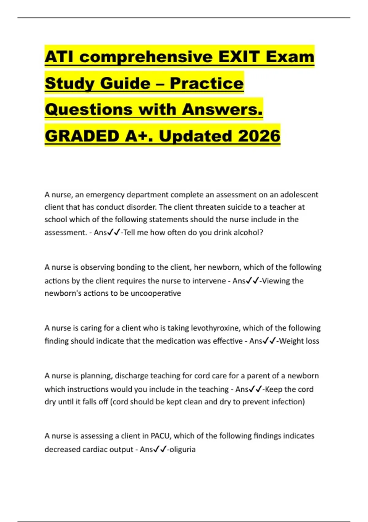 ATI comprehensive EXIT Exam Study Guide – Practice Questions with Answers. GRADED A+. Updated 2026
