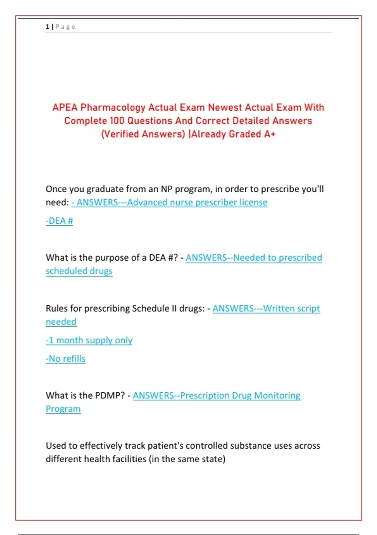 APEA Pharmacology Actual Exam Newest Actual Exam With