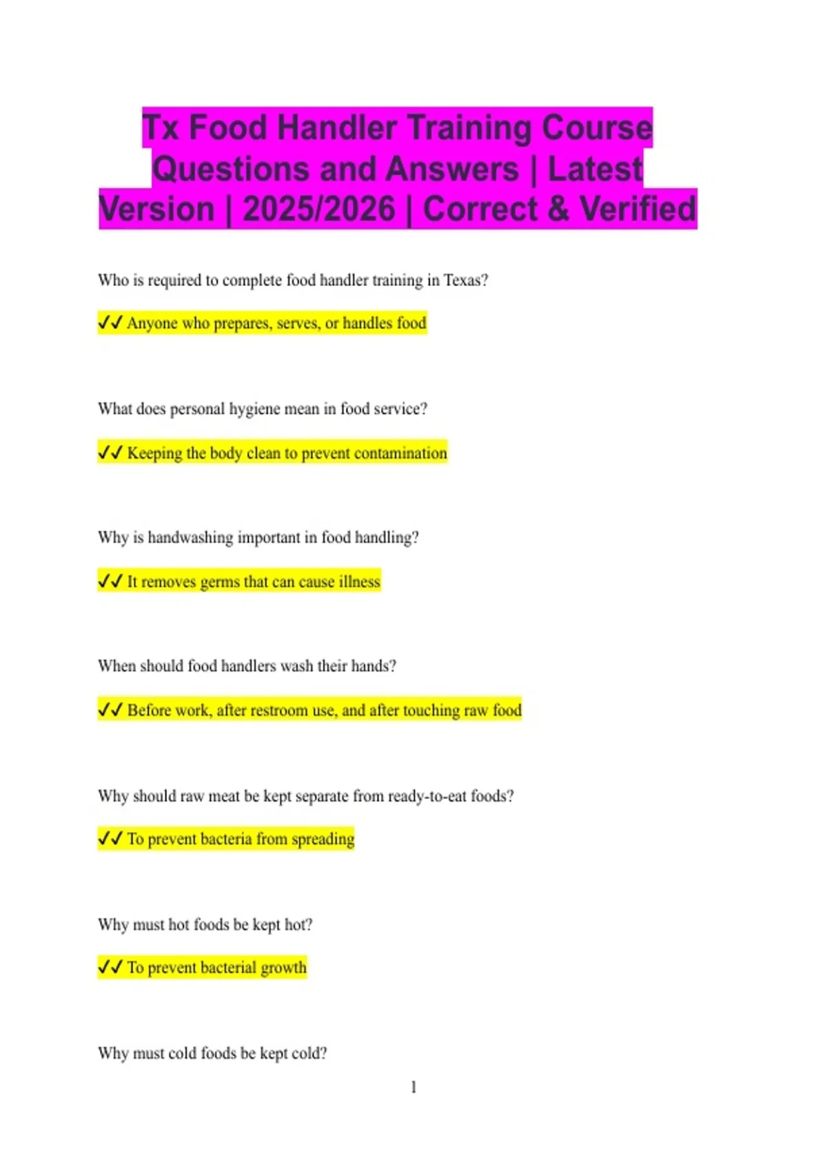 Tx Food Handler Training Course Questions and Answers | Latest Version | 2025/2026 | Correct & Verified