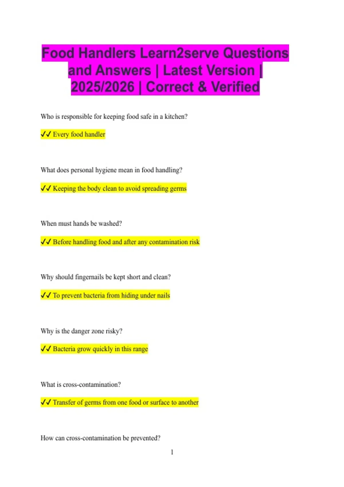 Food Handlers Learn2serve Questions and Answers | Latest Version | 2025/2026 | Correct & Verified Who is responsible for keeping food safe in a kitchen? Every food handler What does personal hygiene mean in food handling? Keeping the body clean to avoid spreading germs When must hands be washed? Before handling food and after any contamination risk Why should fingernails be kept short and clean? To prevent bacteria from hiding under nails Why is the danger zone risky? Bacteria grow quickly in this range What is cross-contamination? Transfer of germs from one food or surface to another How can cross-contamination be prevented? 2 By using separate equipment and washing hands What is a TCS food? Food that needs time and temperature control for safety Why must raw meat be stored below ready-to-eat food? To prevent juices from dripping and contaminating food What is the minimum safe temperature for poultry? 165°F What is the minimum safe temperature for ground meat? 155°F What is the minimum safe temperature for fish? 145°F What does FIFO stand for? First In, First Out Why is FIFO important? It prevents food from expiring and spoiling 3 What is the correct cold holding temperature? 41°F or lower What is the correct hot holding temperature? 135°F or higher What is the safest way to thaw frozen food? In the refrigerator Why should food not be thawed on the counter? Bacteria can grow in the danger zone What is the purpose of a food thermometer? To check internal food temperature When should a thermometer be sanitized? Before and after each use What is sanitizing? Reducing germs to safe levels 4 What is cleaning? Removing visible dirt and food residue Why is sanitizing important after cleaning? Cleaning alone does not kill germs What is a food allergen? A food that causes an allergic reaction Name one common food allergen. Peanuts What should be done if a customer reports an allergic reaction? Get medical help and inform a manager What symptom requires a food handler to stay home? Vomiting or diarrhea Why must sick workers not handle food? They can spread illness What is proper glove use?