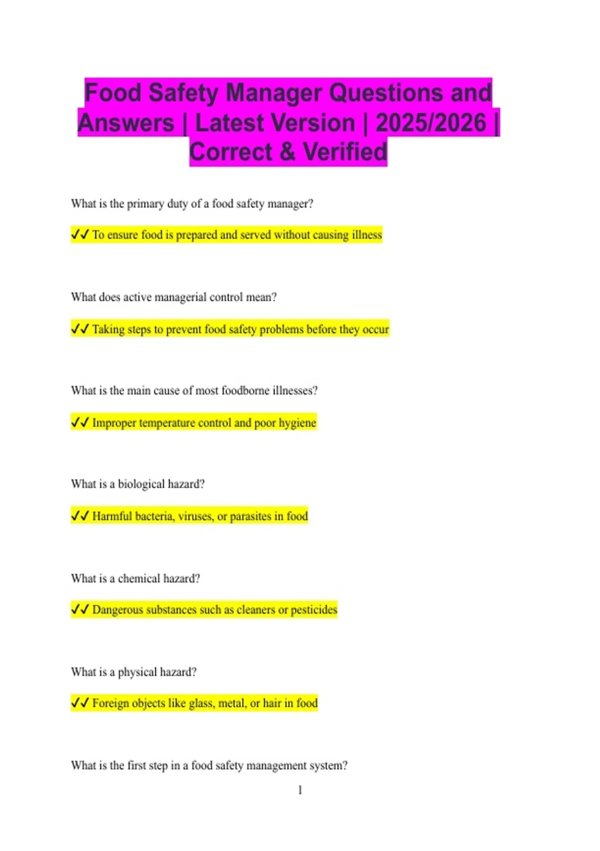 Food Safety Manager Questions and Answers | Latest Version | 2025/2026 | Correct & Verified What is the primary duty of a food safety manager? To ensure food is prepared and served without causing illness What does active managerial control mean? Taking steps to prevent food safety problems before they occur What is the main cause of most foodborne illnesses? Improper temperature control and poor hygiene What is a biological hazard? Harmful bacteria, viruses, or parasites in food What is a chemical hazard? Dangerous substances such as cleaners or pesticides What is a physical hazard? Foreign objects like glass, metal, or hair in food What is the first step in a food safety management system? 2 Identifying potential hazards What does monitoring mean in food safety? Checking procedures to make sure they are working What is corrective action? Steps taken to fix a food safety problem What is verification in food safety? Confirming the system is working correctly What is record keeping used for? Documenting food safety procedures and results What is the temperature danger zone? 41°F to 135°F What is the minimum holding temperature for hot food? 135°F What is the maximum holding temperature for cold food? 41°F 3 What is the minimum internal temperature for poultry? 165°F What is the minimum internal temperature for ground meat? 155°F What is the minimum internal temperature for fish? 145°F How long can food remain in the danger zone safely? No more than 4 hours What is time-temperature abuse? Letting food stay too long at unsafe temperatures What is cross-contamination? Transfer of bacteria from one food or surface to another What is cross-contact? Transfer of allergens to food 4 What are the Big Six food allergens? Milk, eggs, wheat, soy, peanuts, and shellfish