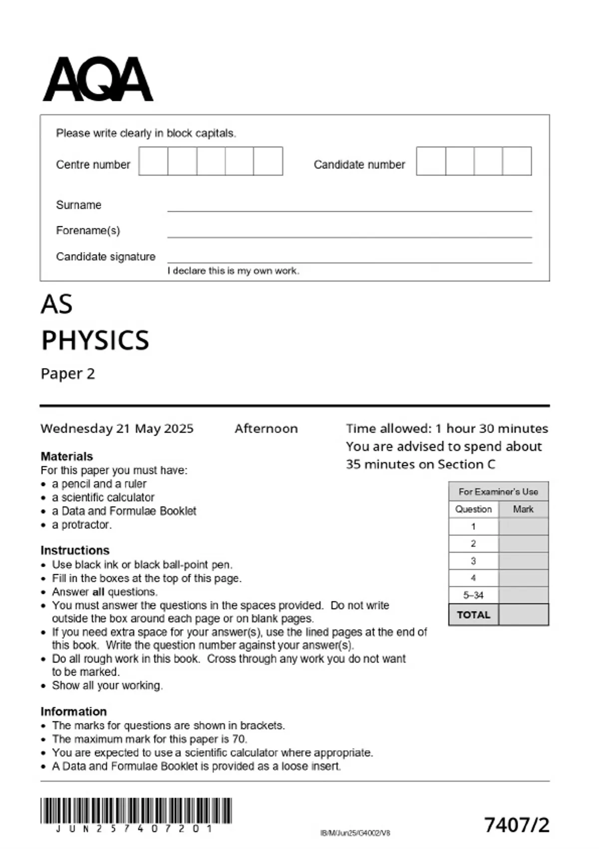 2025 AQA AS Physics 7407 ALL EXAMS WITH QUESTION PAPERS AND MARK SCHEMES