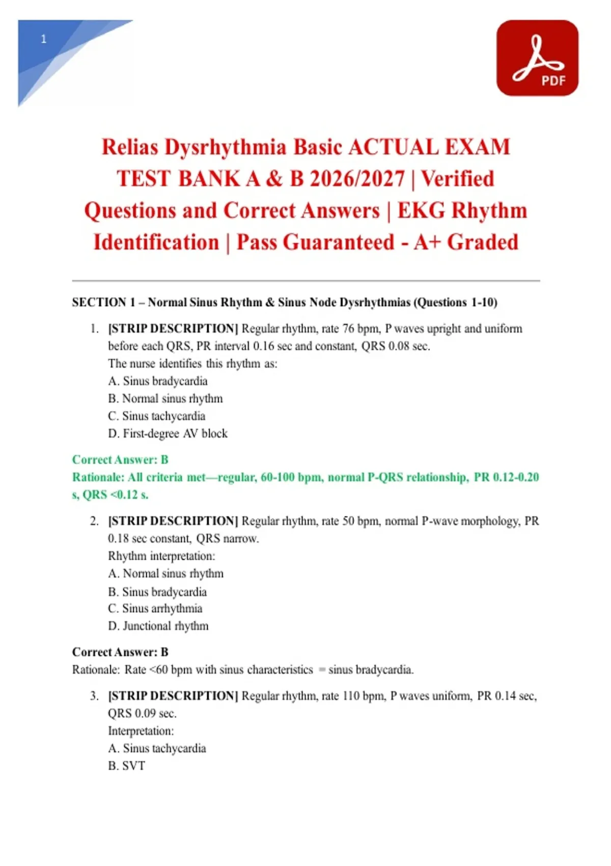 PASS THE RELIAS DYSRHYTHMIA BASIC EXAM WITH THE COMPLETE TEST BANKS! This A+ Graded ultimate bundle for the Relias Dysrhythmia Basic Actual Exam (2026/2027) includes Test Bank A & B with Verified Questions and Correct Answers. Master EKG rhythm identification for sinus, atrial, junctional, ventricular, and heart blocks with materials that mirror the official Relias format and grading criteria. With clear, step-by-step rationales and a Pass Guarantee, this is your definitive resource to ace the exam and prove your competency. Download both test banks now.